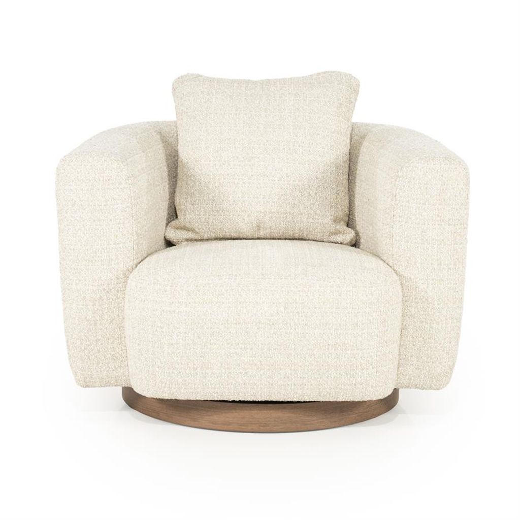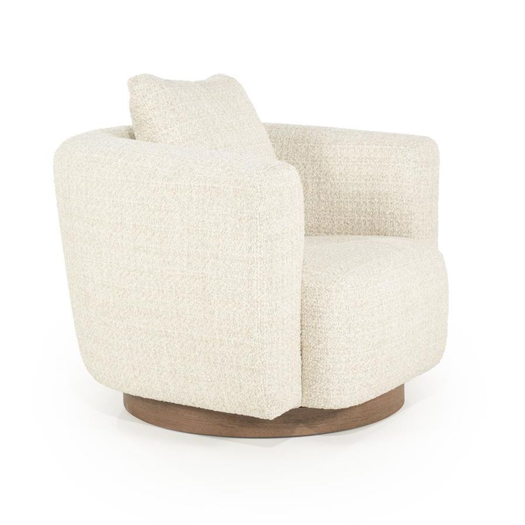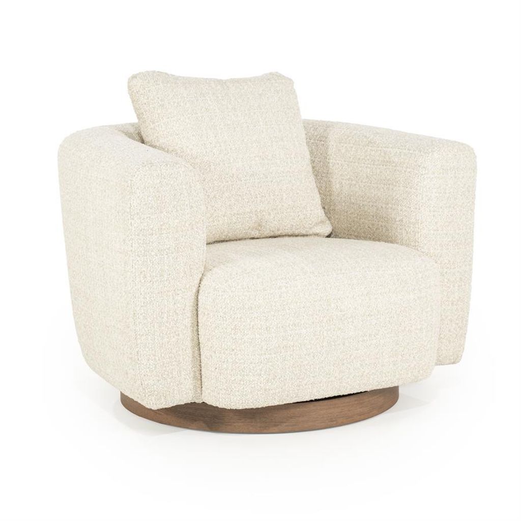Elegant beige fåtölj med mjuk textur och snurrfunktion, perfekt för stil och komfort i ditt hem.