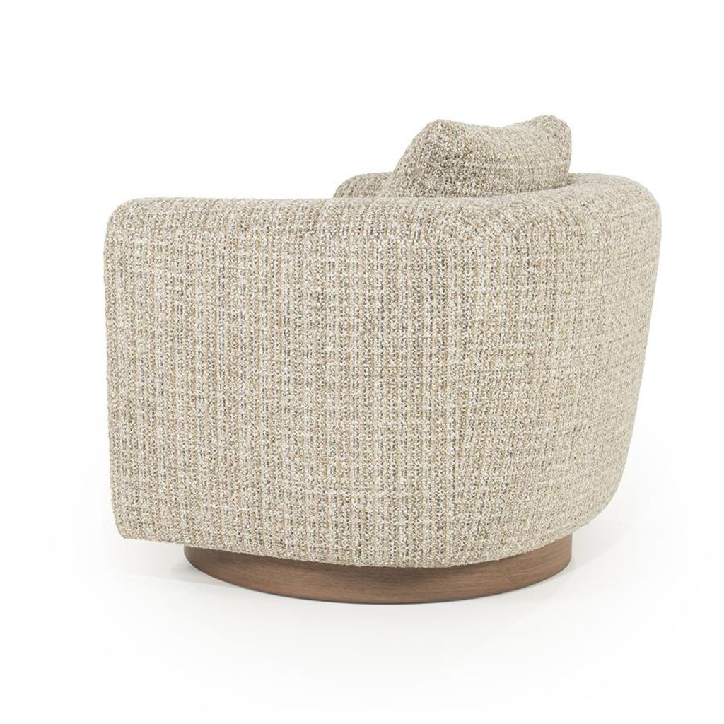 Elegant fåtölj med mjukt taupefärgat tyg och stilren design. Perfekt för en modern inredning.