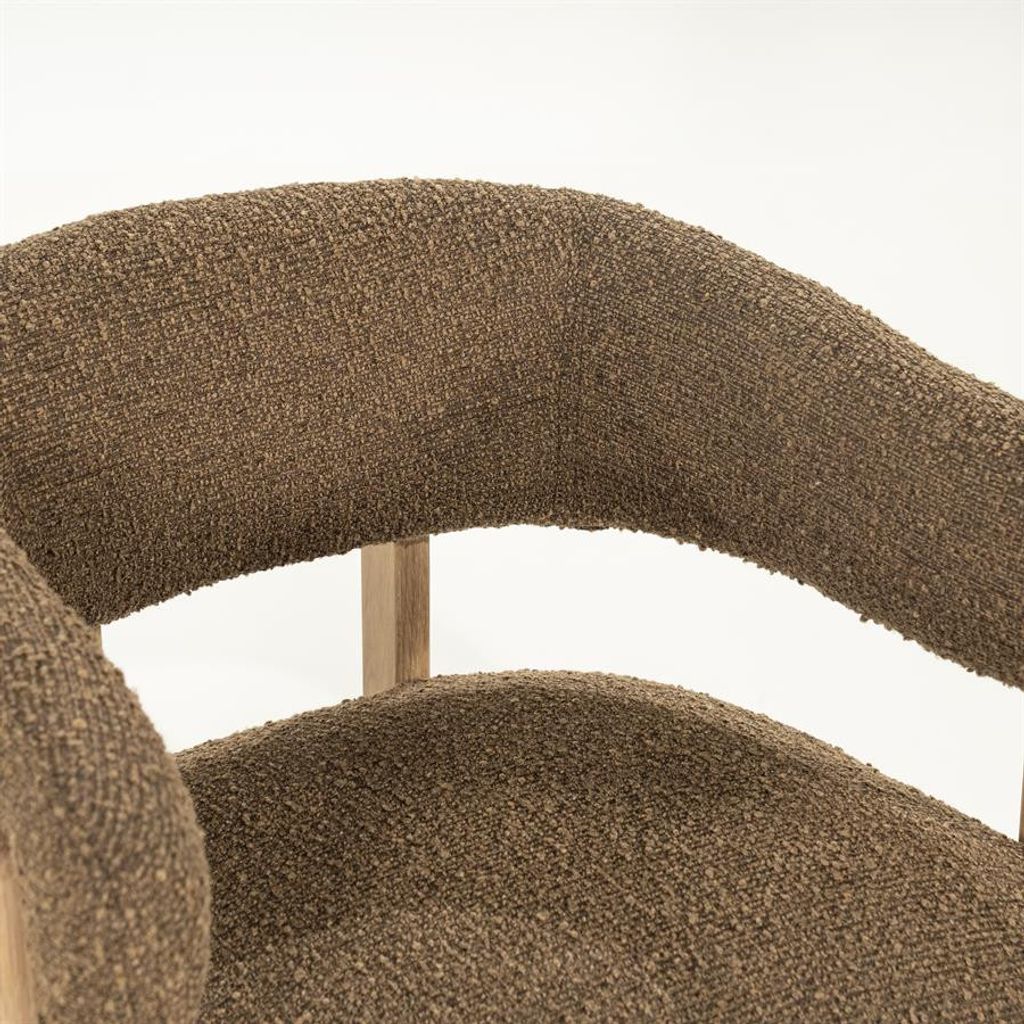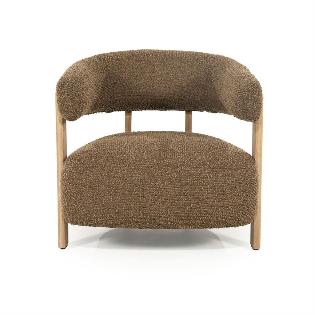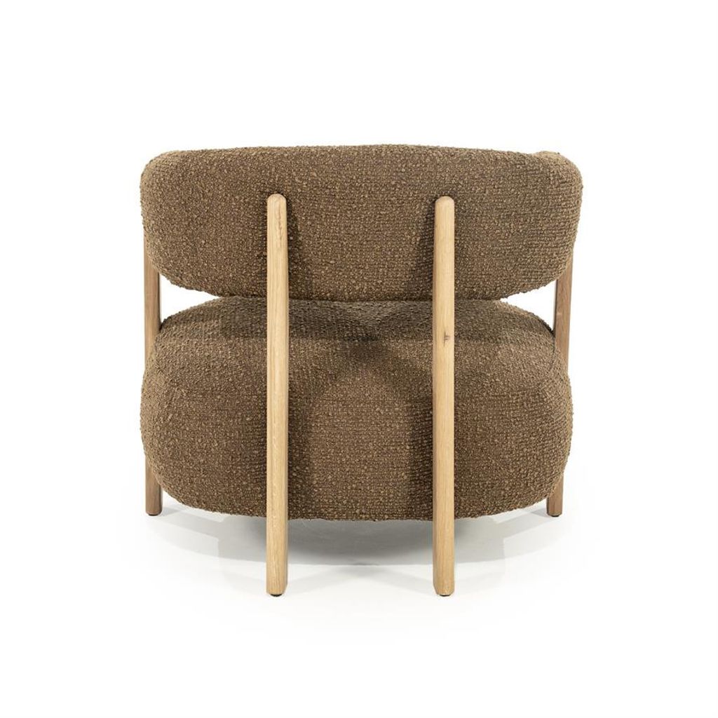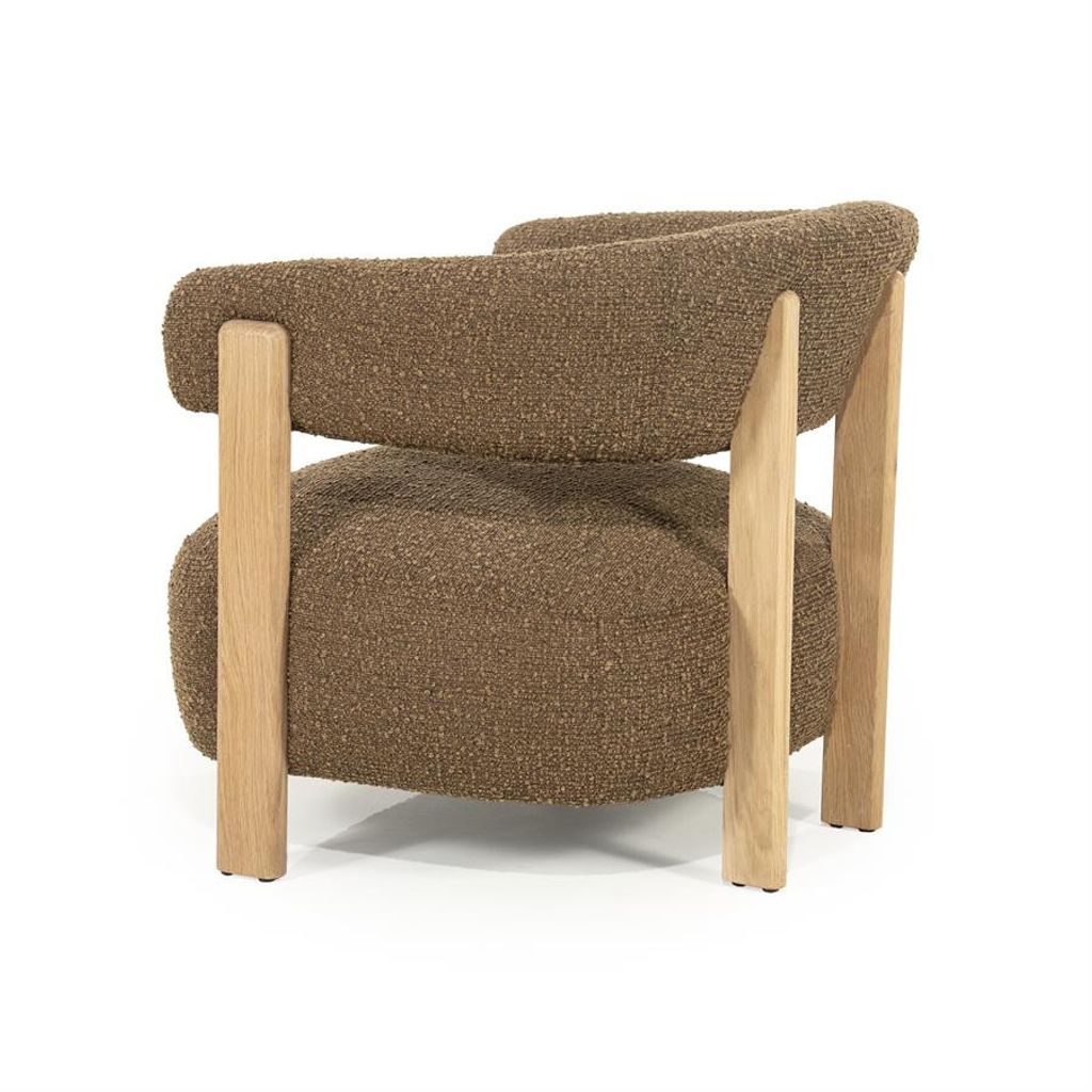 Elegant fåtölj i brun strukturväv och ek, perfekt för stilmedvetna hem.