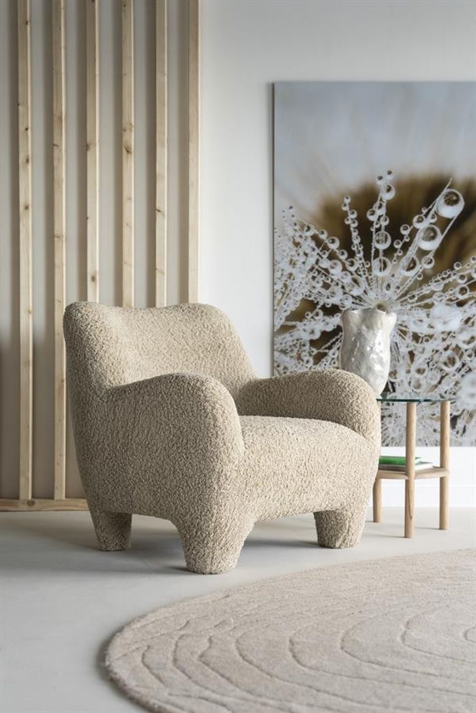 Upptäck Eleonora Fåtölj Shaun i taupe-färgat fårpälsmaterial, en inbjudande fåtölj som kombinerar komfort med stil.