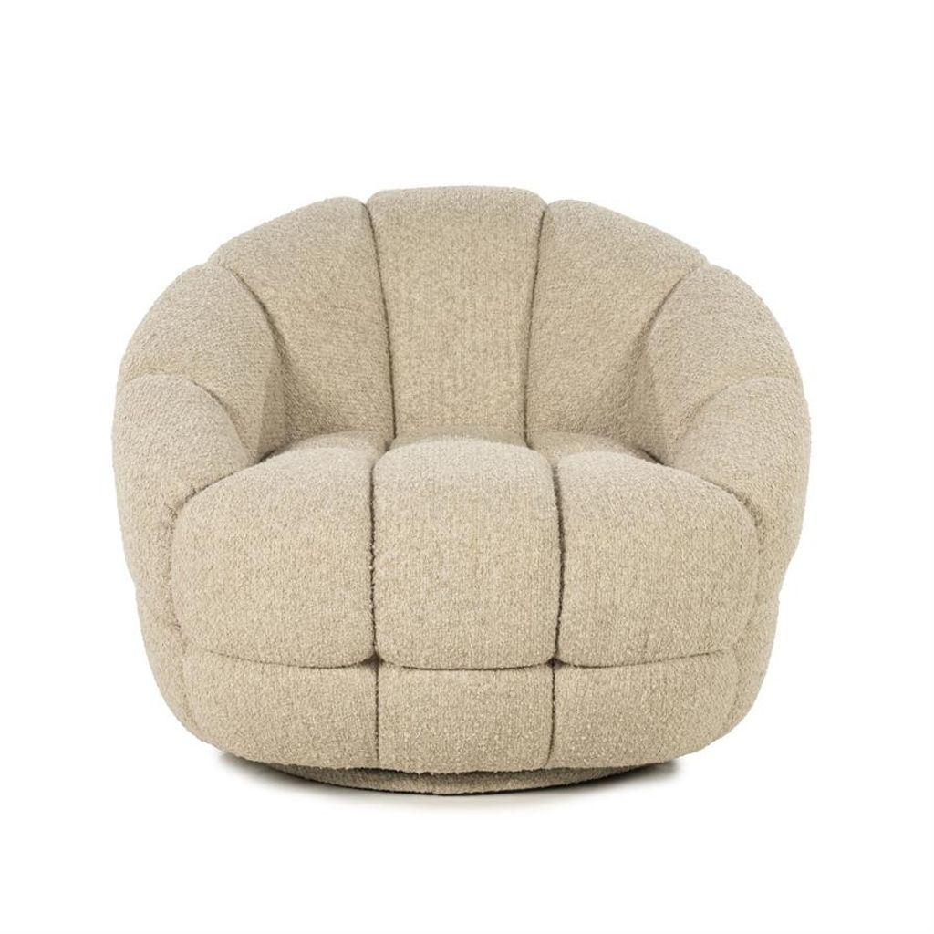 Tina-fåtöljen från Eleonora erbjuder en elegant design med mjuk, strukturerad beige klädsel som ger både komfort och stil till ditt hem.