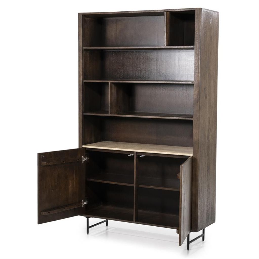 Elegant och robust bokhylla i brunt trä med praktiska hyllplan och skåp för stilren förvaring.