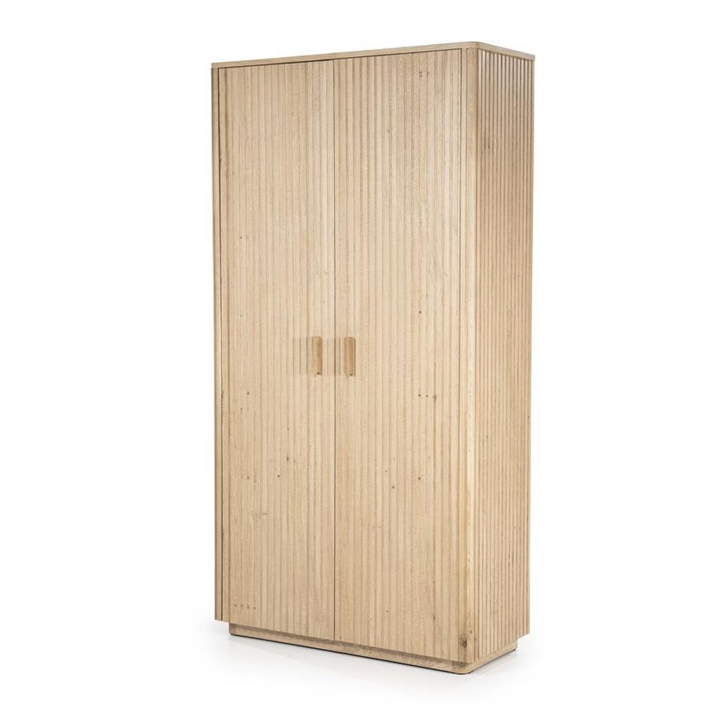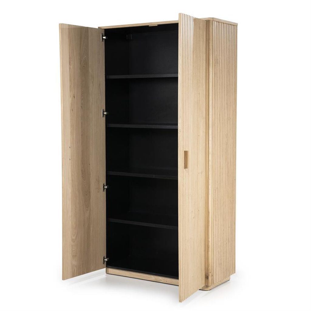 Eleonora Skåp Rosenborg är ett stilrent skåp tillverkat i vacker ek med en elegant ribbad yta. Skåpets ljusa träfinish ger en tidlös känsla som passar perfekt i moderna hem. Inuti hittar du rymliga hyllor med en kontrasterande svart färg som erbjuder generös förvaring för dina tillhörigheter. Dörrarna är utrustade med diskreta, robusta handtag som bidrar till skåpets minimalistiska estetik. Perfekt för att organisera och förvara, samtidigt som det tillför en sofistikerad touch till ditt rum.