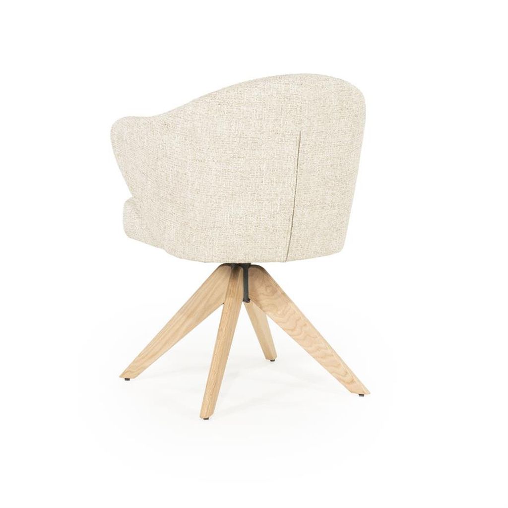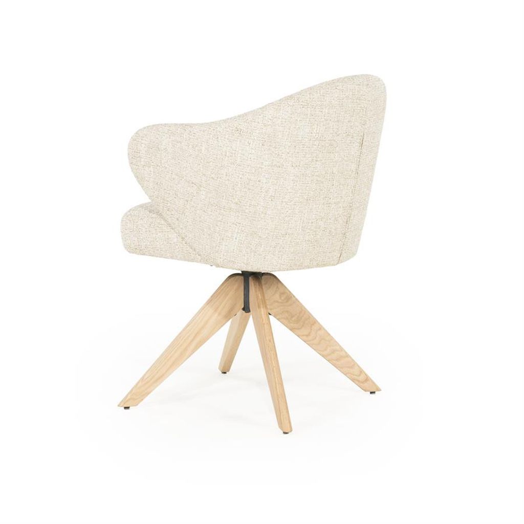 En stilren stol i naturnära beige med bekvämt tyg och robust träbas, perfekt för både matplats och vardagsrum.
