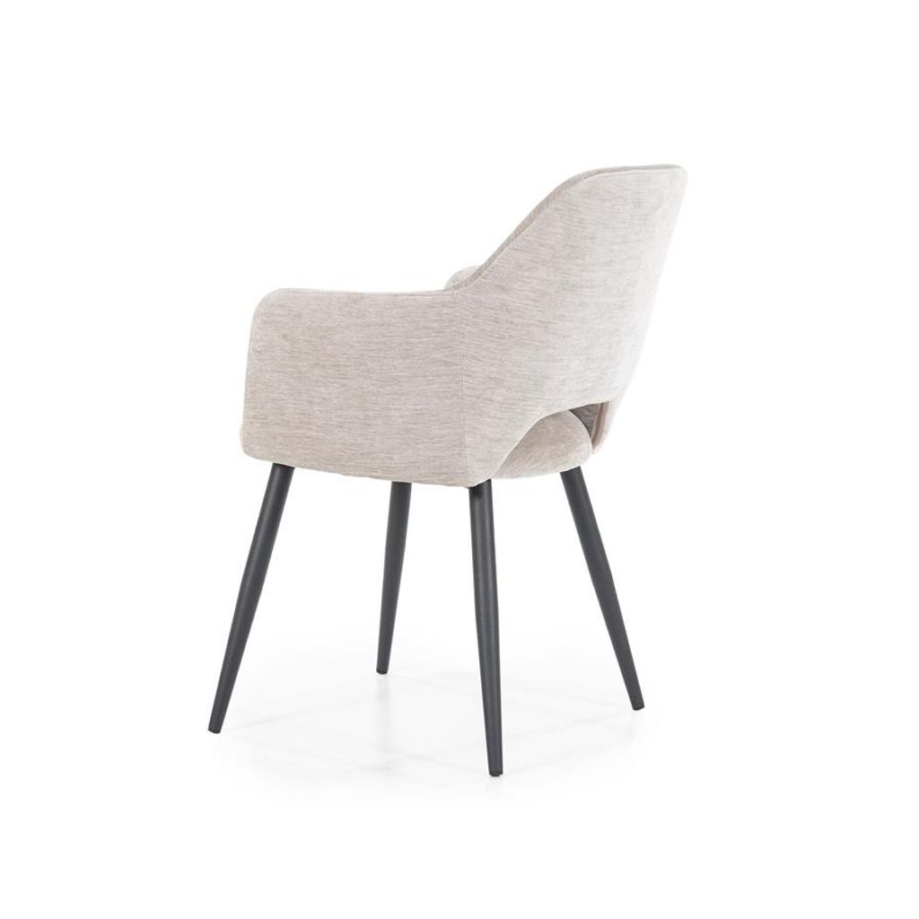 Stilren och bekväm stol i beige tyg med robusta svarta ben, perfekt för både matplats och kontor.