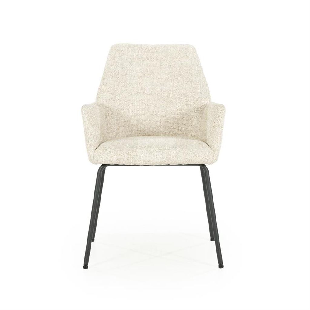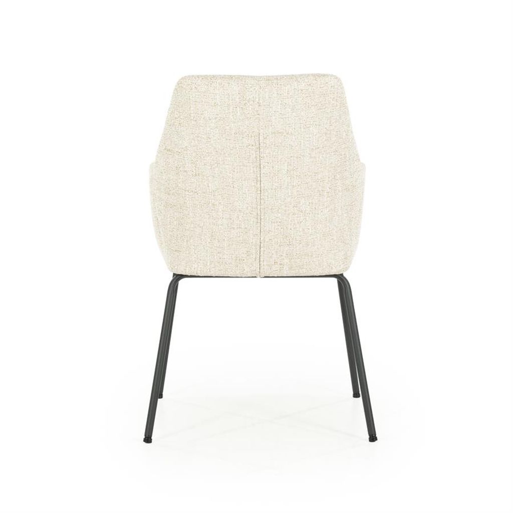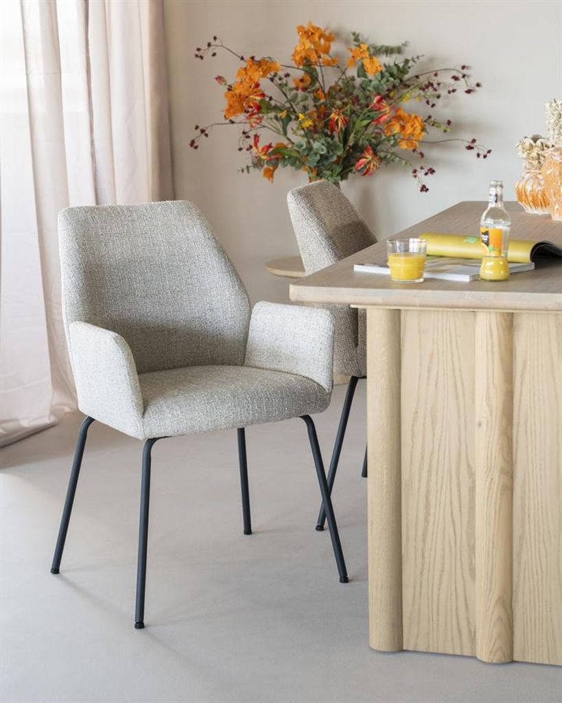 Eleonora stol Indy i beige Donna kombinerar stilren design med komfort. Den mjuka beige färgen och tygets taktila textur ger en varm känsla, medan de svarta benen i metall skapar en elegant kontrast och stabilitet. Stolen är utformad med en bekväm sits och ryggstöd, vilket gör den perfekt för både matplats och vardagsrum. Dess moderna silhuett passar enkelt in i olika inredningsstilar och ger ditt hem en sofistikerad touch.