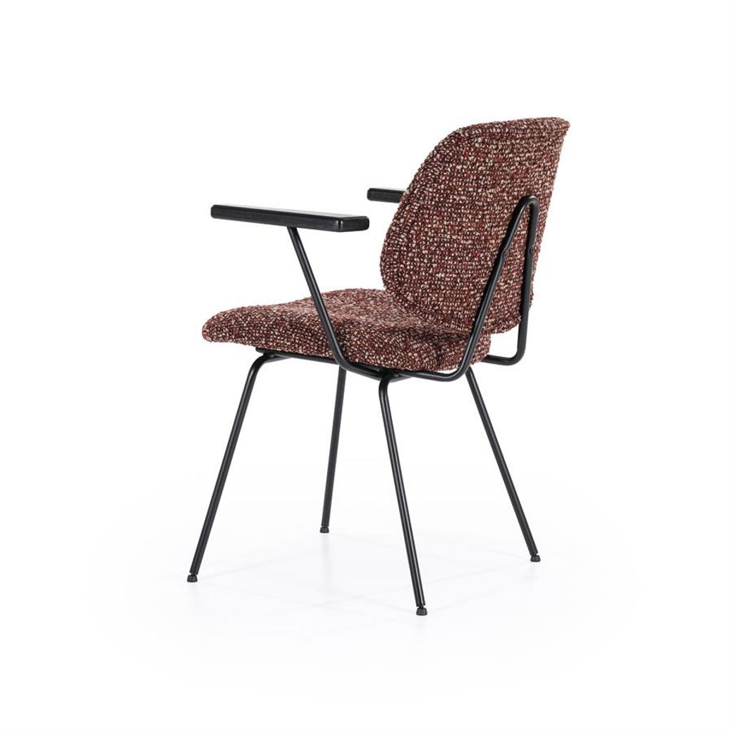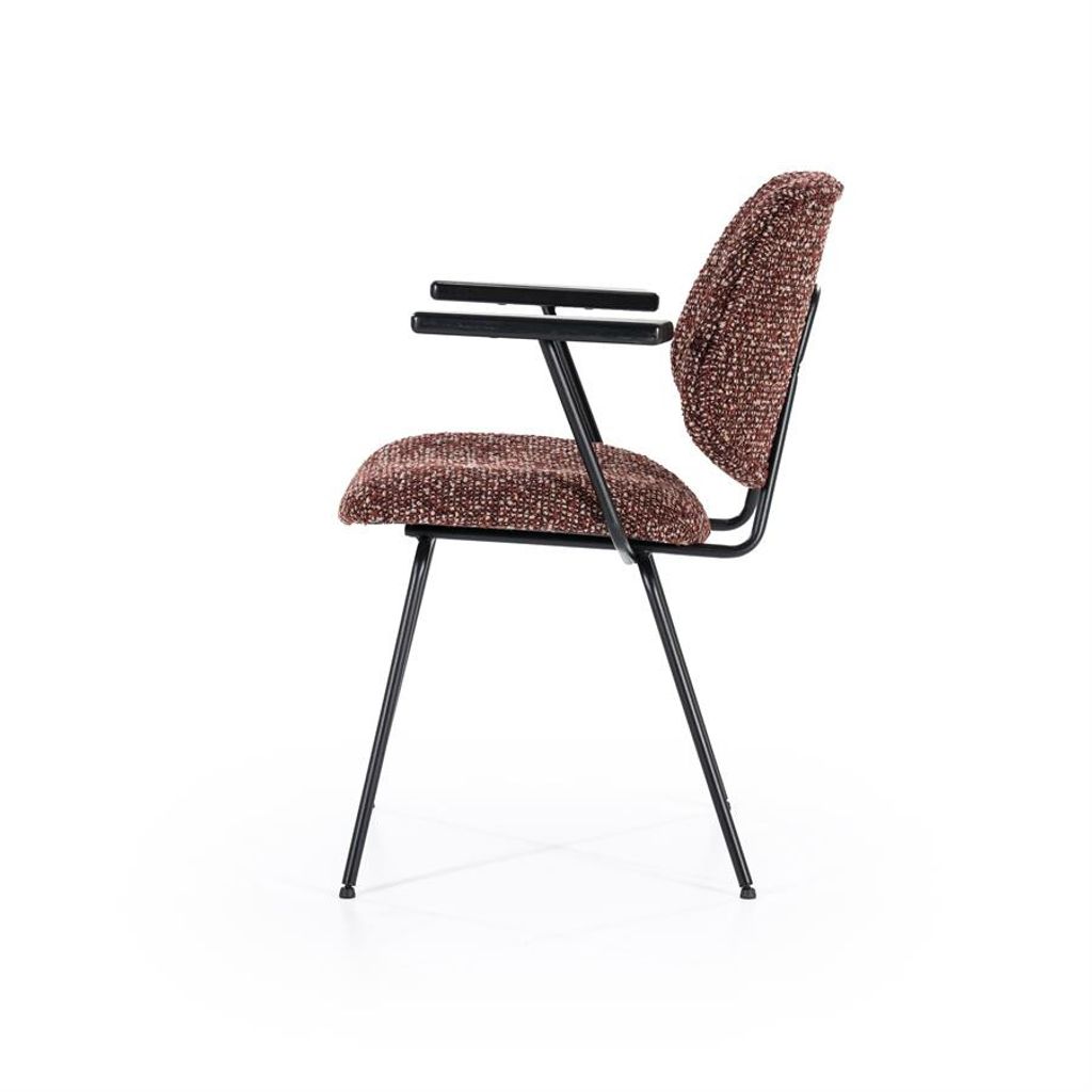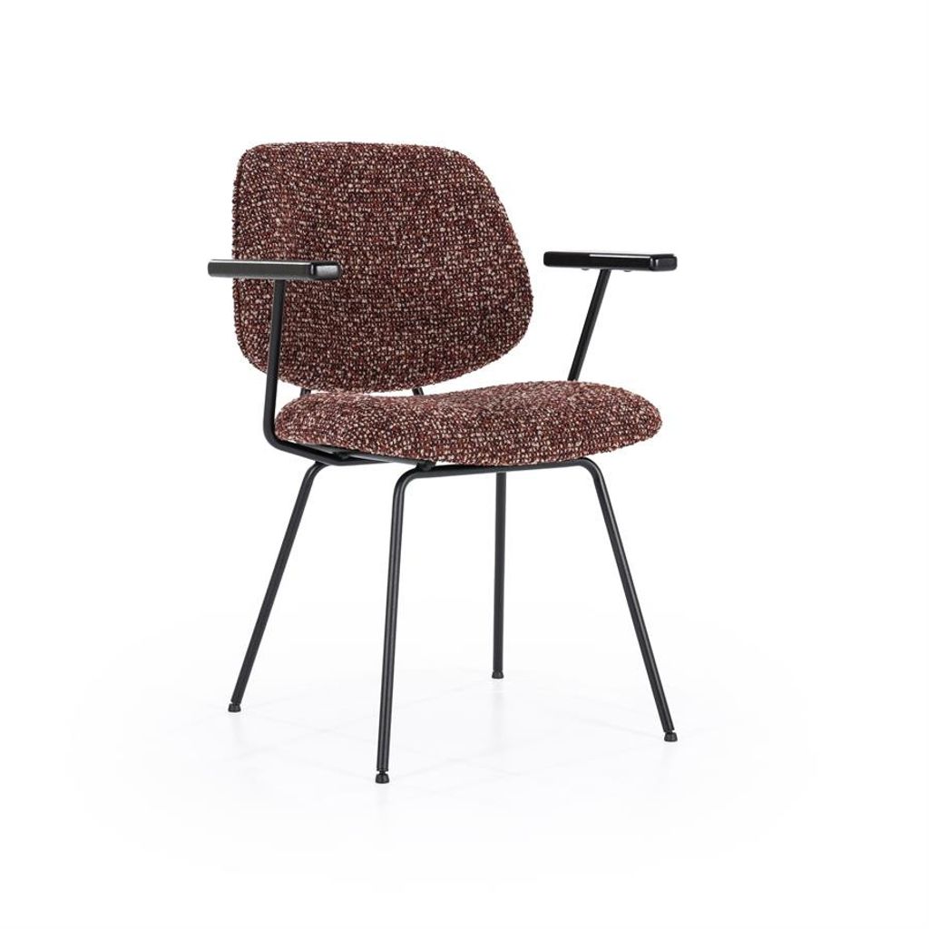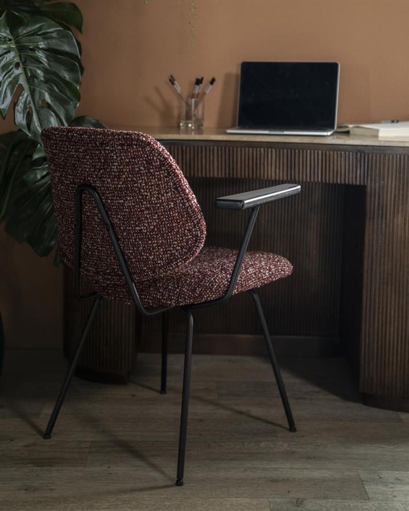 Eleonora Stol Jon med armstöd kombinerar elegans och komfort. Den röda Maywood-klädseln ger en varm och inbjudande känsla, medan de svarta, pulverlackerade metallbenen säkerställer en stabil och hållbar konstruktion. Bekväma armstöd i trä ger extra stöd, vilket gör stolen perfekt för både middagar och avkoppling vid skrivbordet. En tidlös design som passar in i moderna och klassiska miljöer.