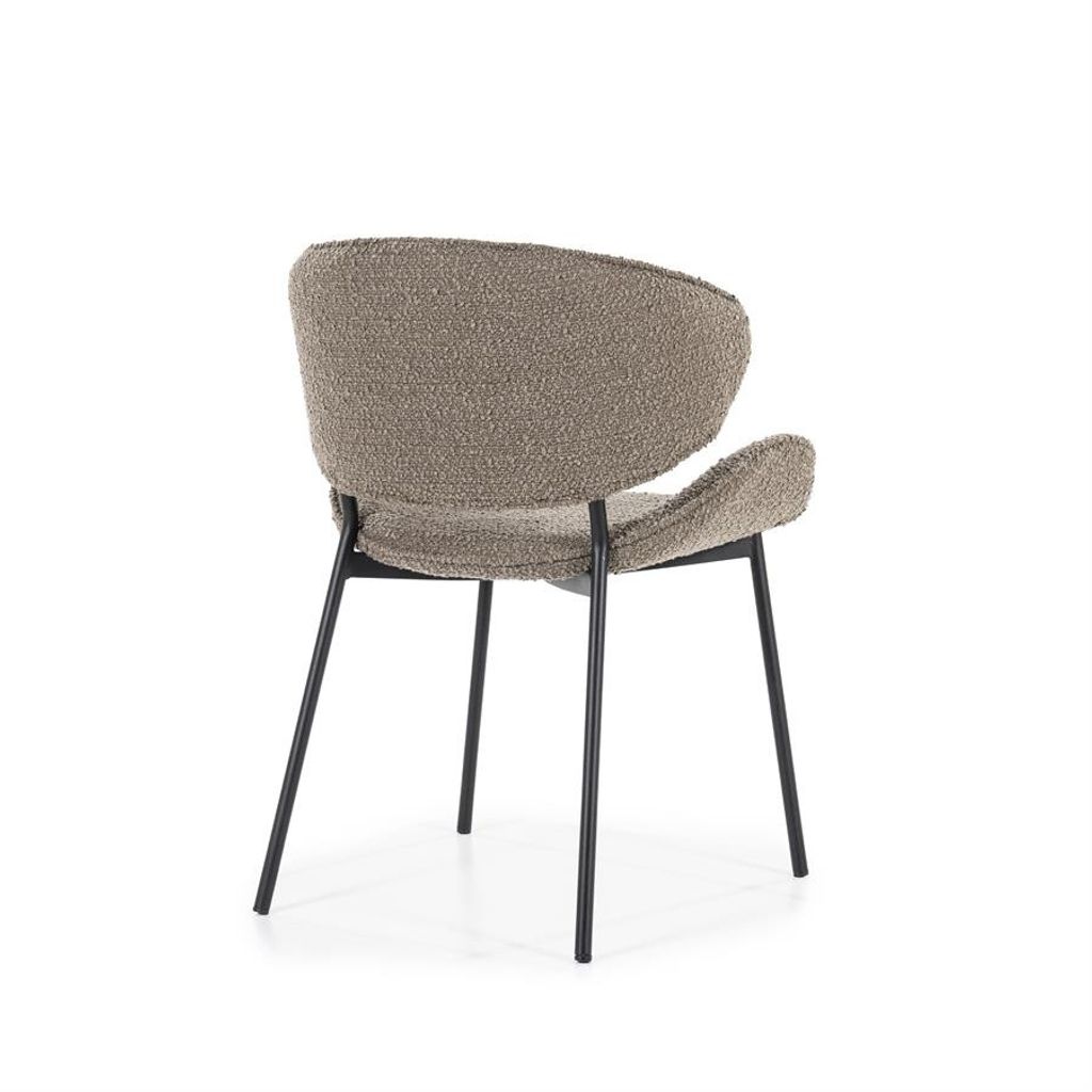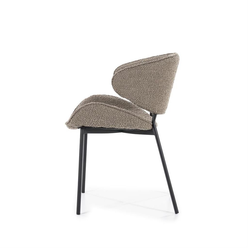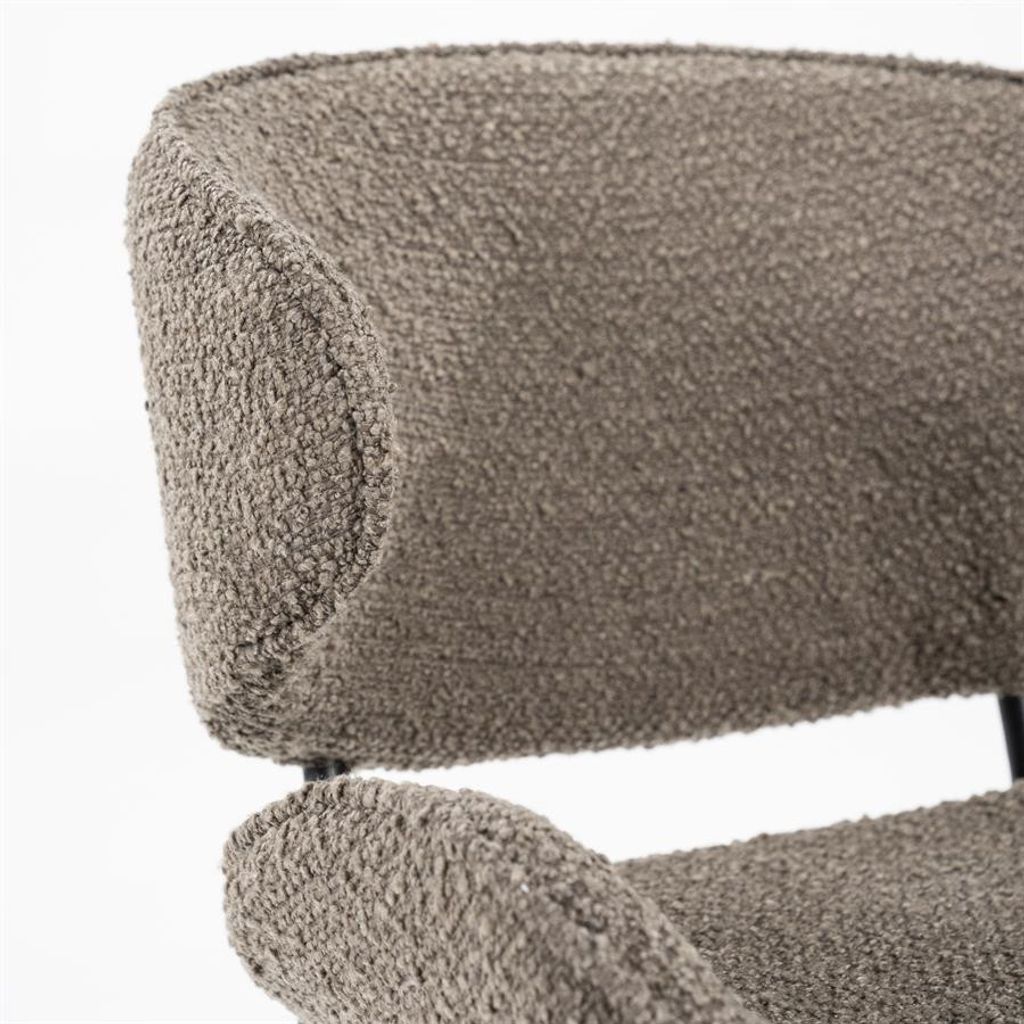 Eleonora Stolen Tess erbjuder stilfull komfort med sin bruna boucléklädsel och robust svart metallram, perfekt för moderna hem.