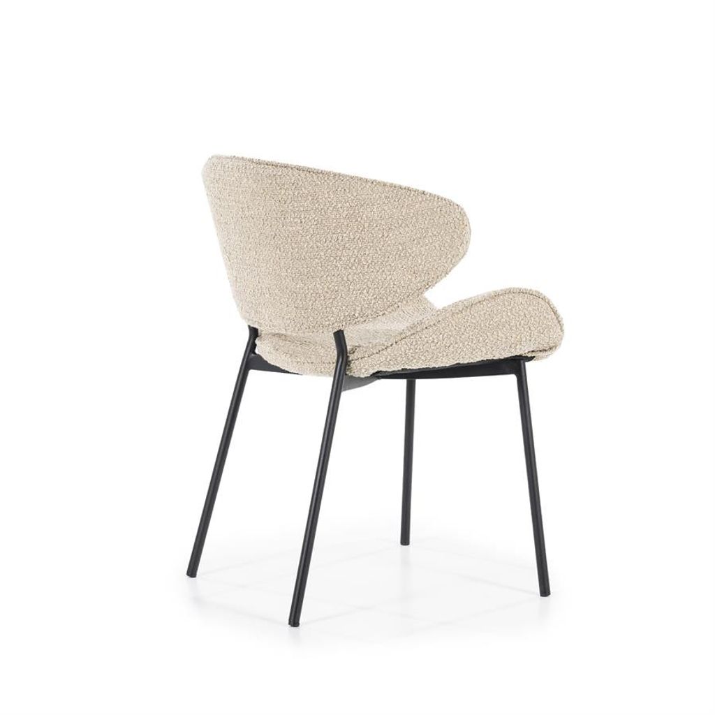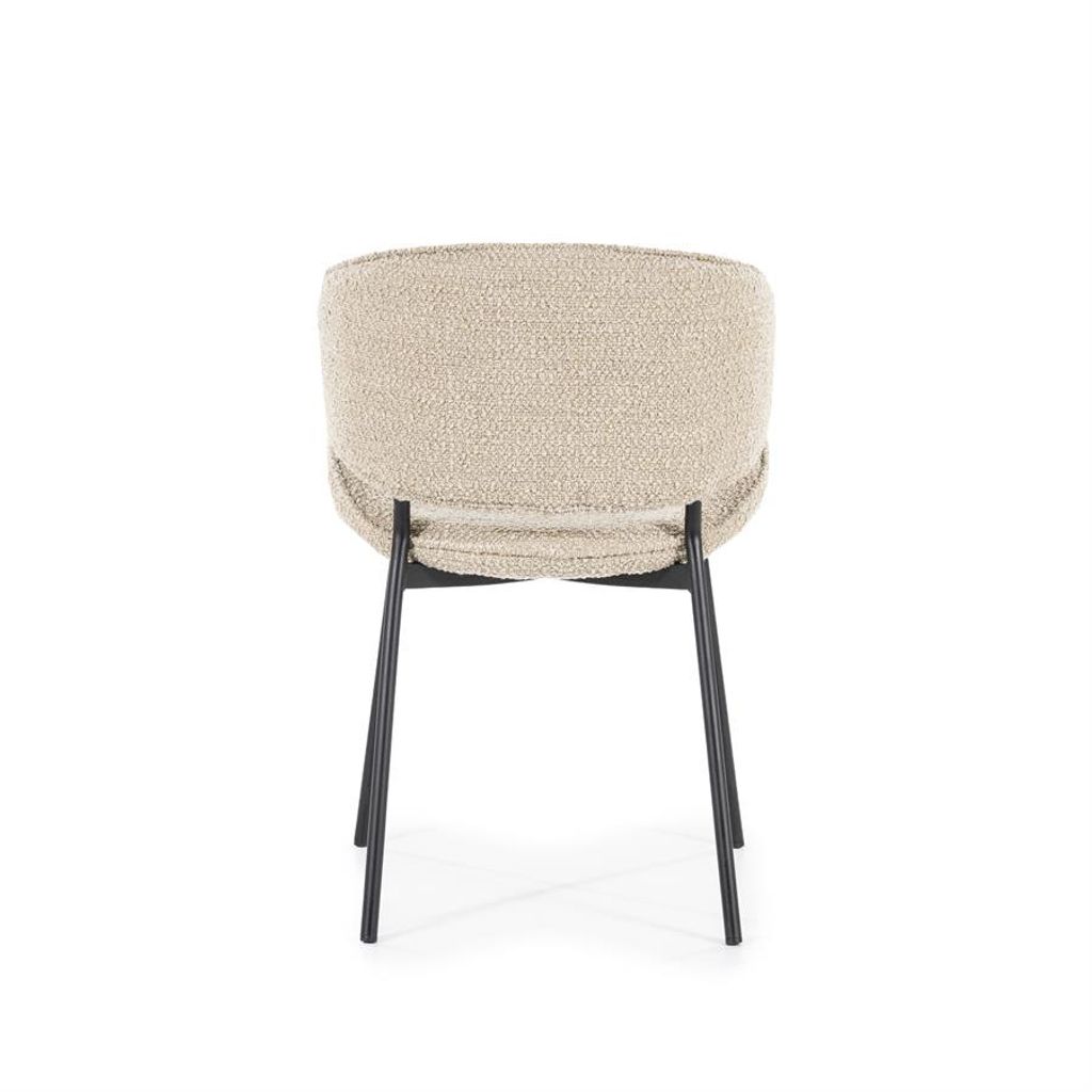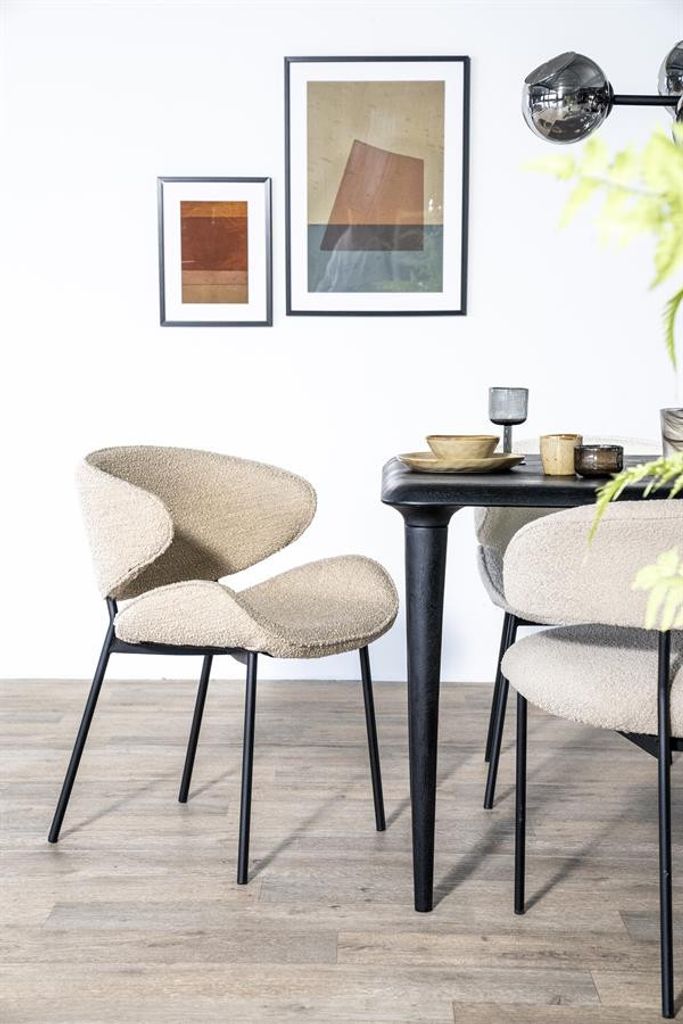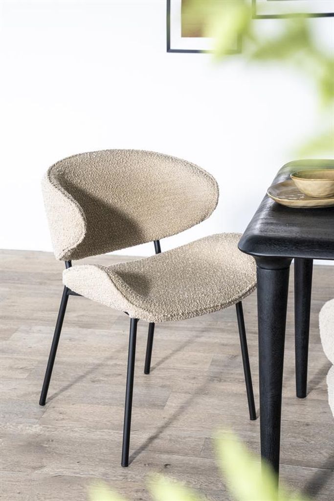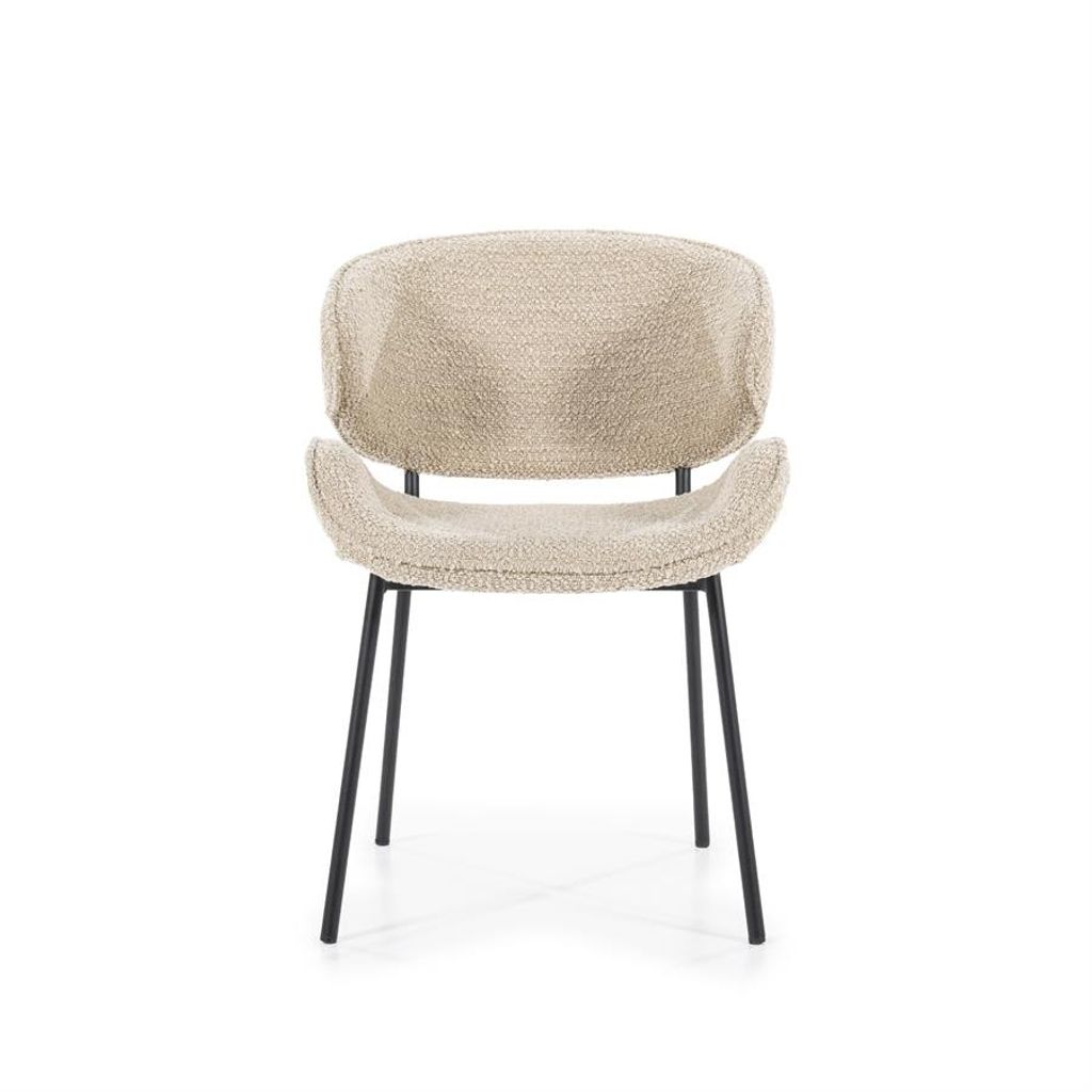 Stilren och bekväm stol i sandfärgad strukturerad textil med robusta svarta ben. Perfekt för både matplats och vardagsrum.