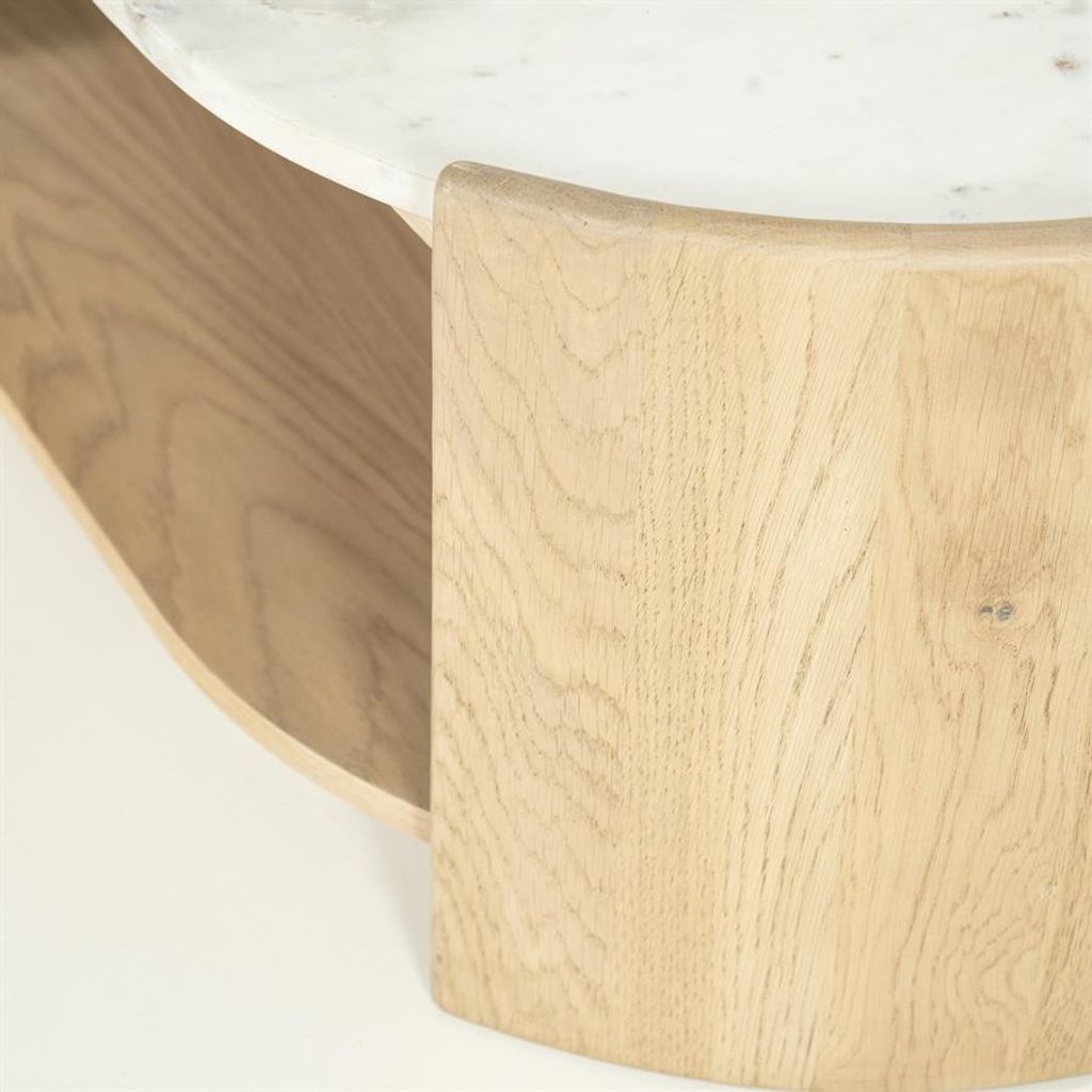Elegant soffbord i naturlig ek och marmor, perfekt för stilrena hem.