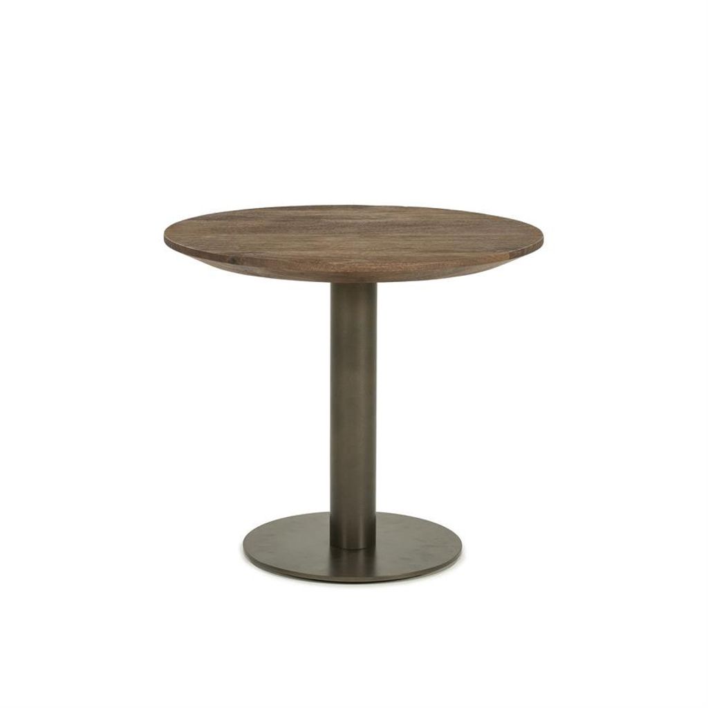 Elegant soffbord i kompakt design med en vacker träyta och robust metallbas. Perfekt för moderna hem.