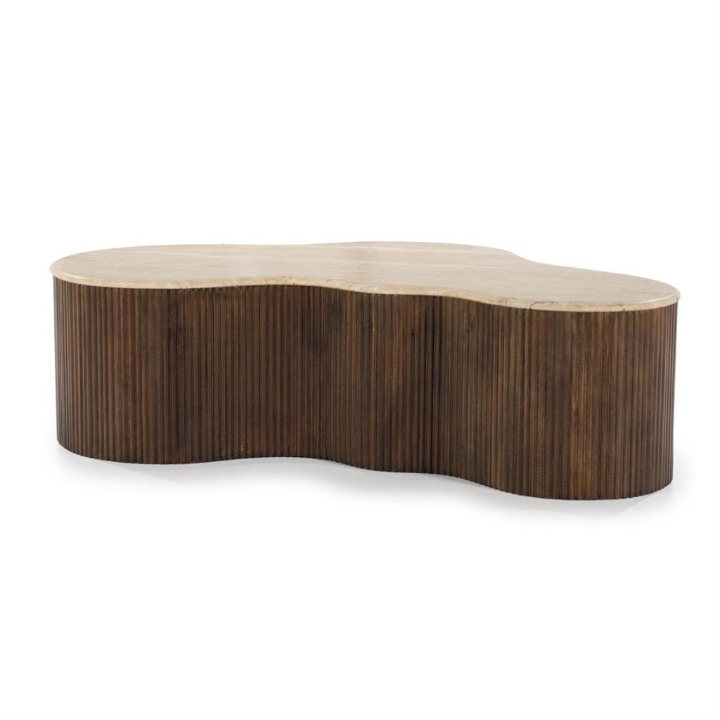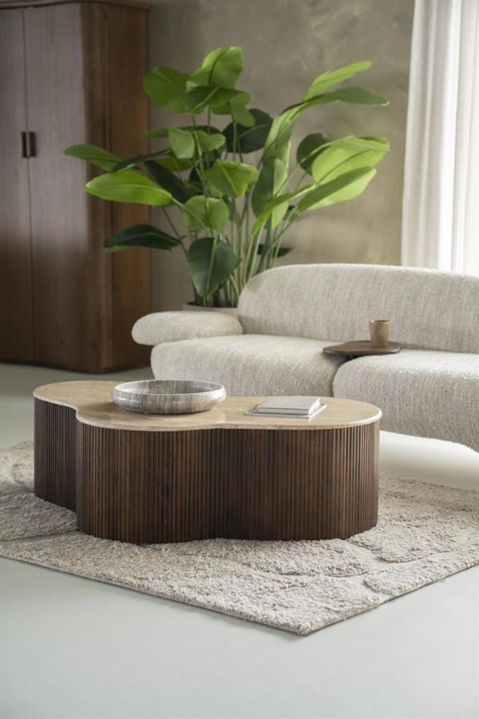 Eleonora Soffbord Mari är ett elegant tillskott till ditt vardagsrum, med sin unika, organiska form som drar blickarna till sig. Bordets skiva är tillverkad av natursten i en mjuk, vågig design som kompletterar det ribbade underredet i mörkt trä. Den harmoniska kombinationen av material ger en känsla av sofistikation och tidlöshet, medan de neutrala bruna tonerna passar perfekt in i de flesta inredningsstilar. Med en storlek på 129x84x36 cm erbjuder detta soffbord både stil och funktionalitet, vilket gör det till en idealisk mittpunkt i ditt vardagsrum.
