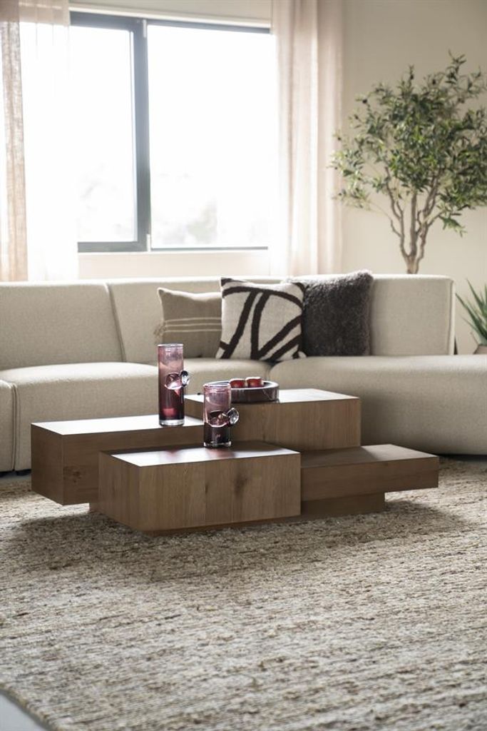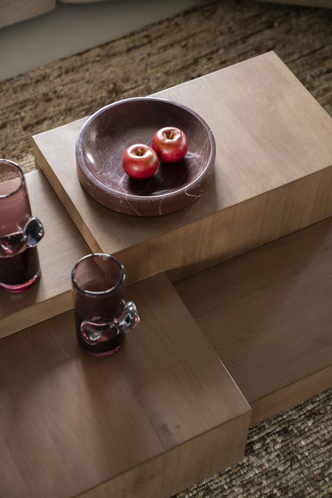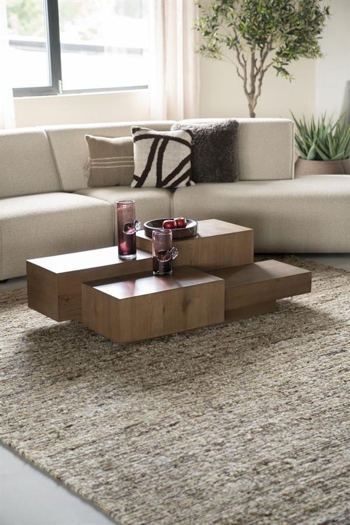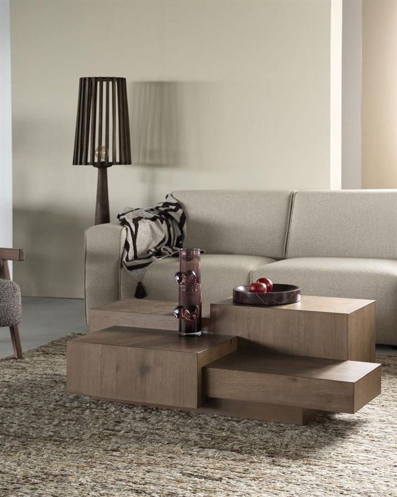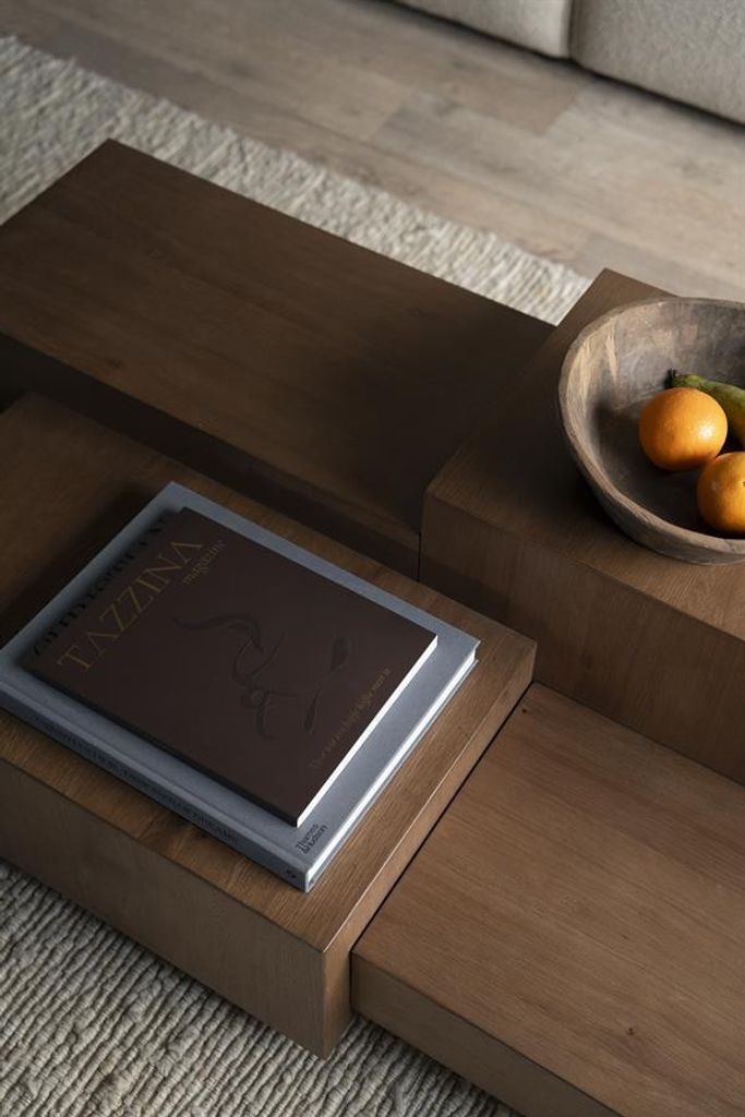 Eleonora Soffbord Quinten i brun nyans imponerar med sin moderna, rektangulära design och noggrant utvalda ekmaterial. Detta stilfulla bord, med sin unika nivåstruktur, är både ett praktiskt och dekorativt inslag i ditt hem. Ytan visar ekens naturliga ådring, vilket ger en varm och inbjudande känsla. Perfekt för att placera böcker, dekorationer eller en kopp kaffe. Upplev kombinationen av funktion och estetik med detta sofistikerade soffbord, designat för att passa perfekt i det moderna hemmet.