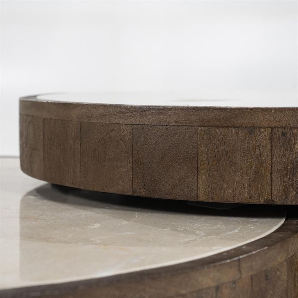 Elegant soffbordsset i brun träfinish och marmortopp, perfekt för modern inredning.