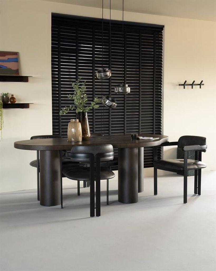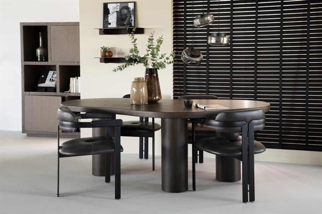 Eleonora Matbord Bobbie Brun är en elegant och modern möbel som kombinerar stil och funktionalitet. Med sin unika, oregelbundna form blir detta bord en iögonfallande mittpunkt i varje matsal. Den mörkbruna finishen ger en sofistikerad ton, medan de robusta, cylinderformade benen säkerställer stabilitet och hållbarhet. Bordets design gör det idealiskt för både intima familjemiddagar och större sociala tillställningar. Dess eleganta utseende kompletterar olika inredningsstilar, från modern till klassisk. Investera i ett matbord som erbjuder både estetik och praktisk funktion till ditt hem.
