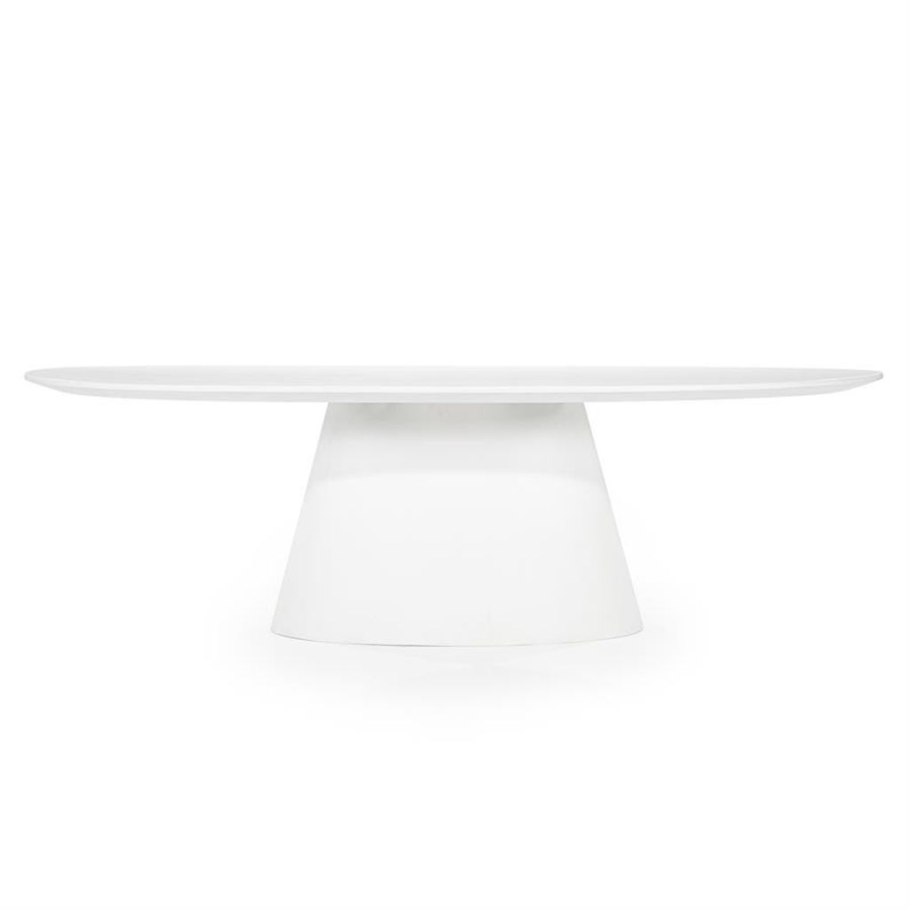 Elegant och rymligt ovalt matbord i vitt, perfekt för stilfulla middagar och sociala sammankomster.