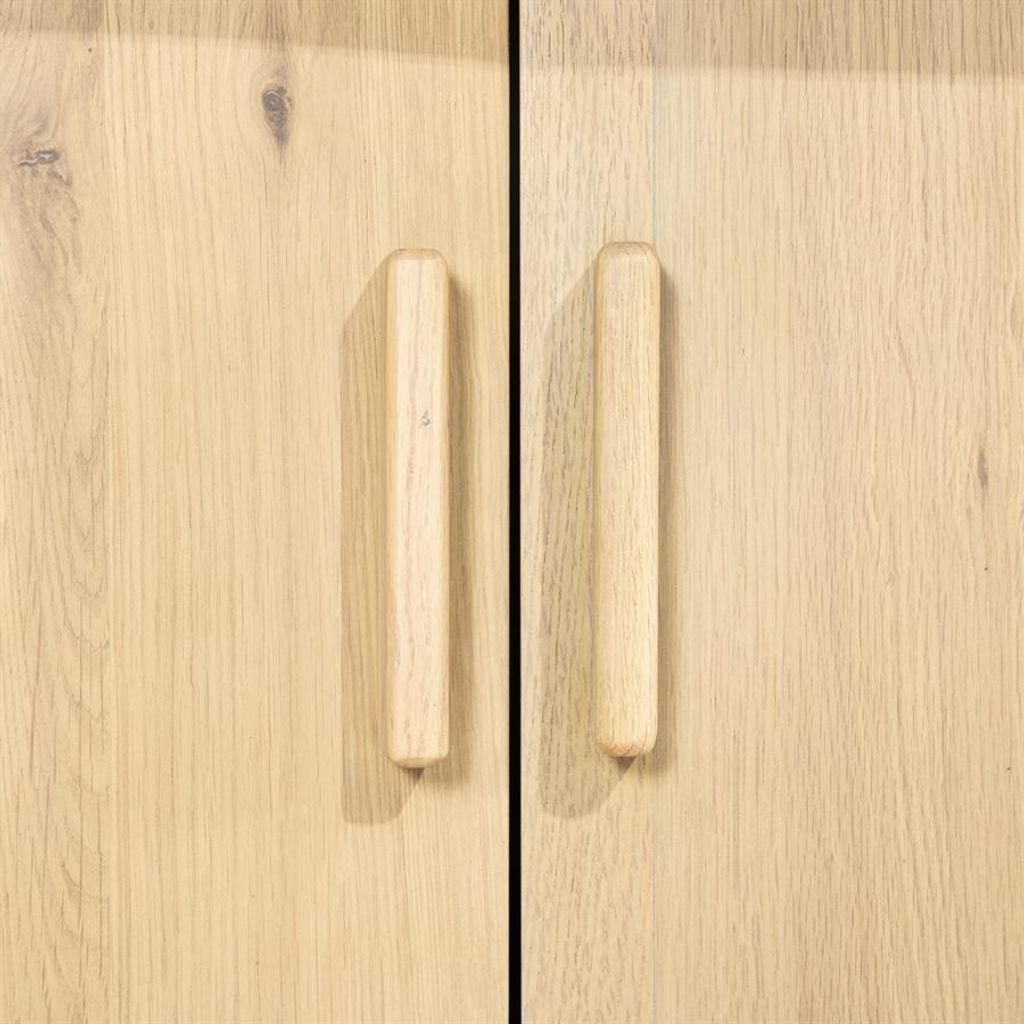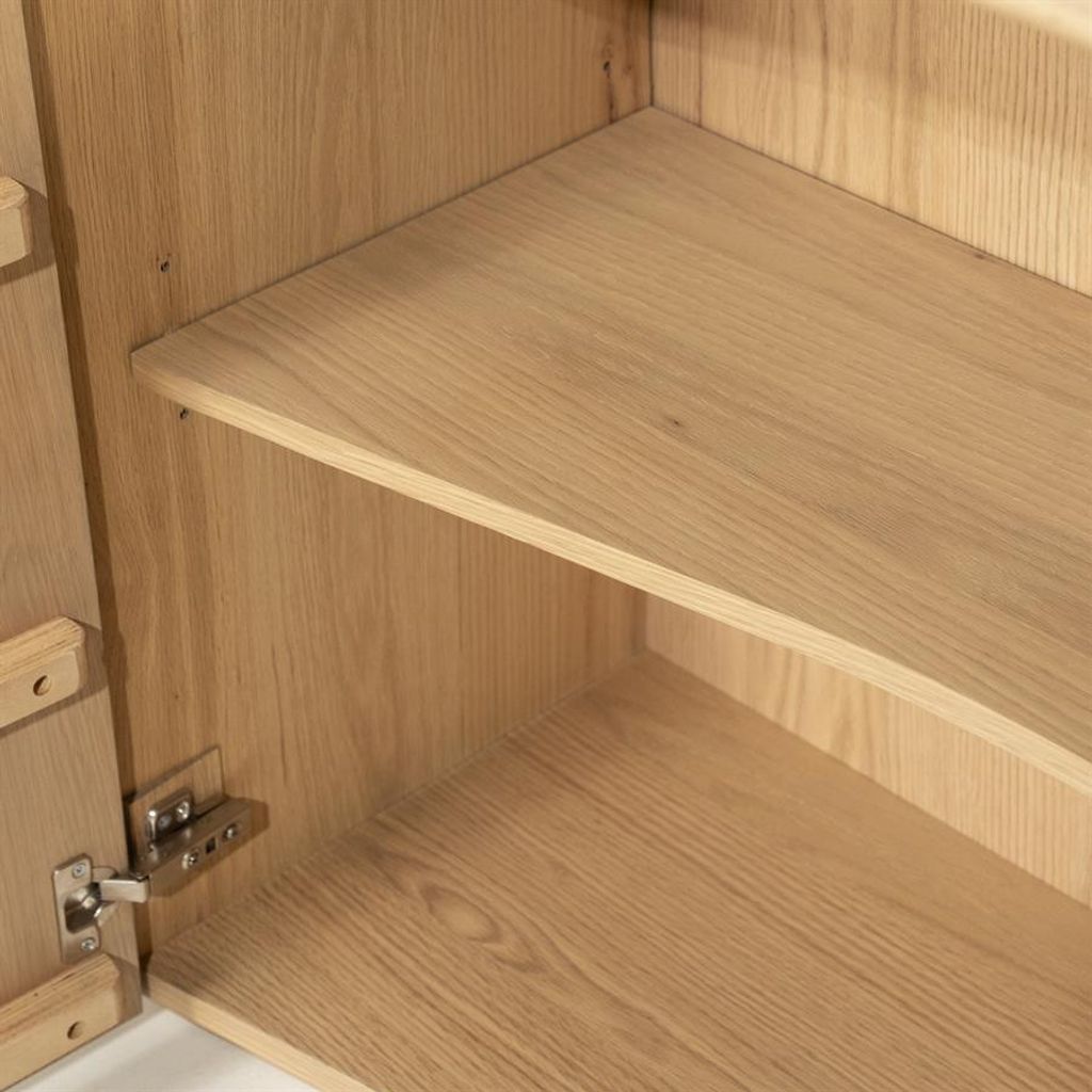 Eleonora Sideboard Josh i naturlig ek kombinerar modern estetik med funktionalitet. Med sina mjuka, rundade former och naturliga träfinish ger detta sideboard en varm och inbjudande känsla till ditt hem. De gedigna trädörrarna öppnar upp till rymliga hyllor, perfekt för att organisera och förvara dina ägodelar. De robusta handtagen i trä harmoniserar med den övergripande designen och skapar en sofistikerad look. Idealiskt för både vardagsrum och matsal, detta sideboard är ett måste för alla som värderar kvalitet och stil.