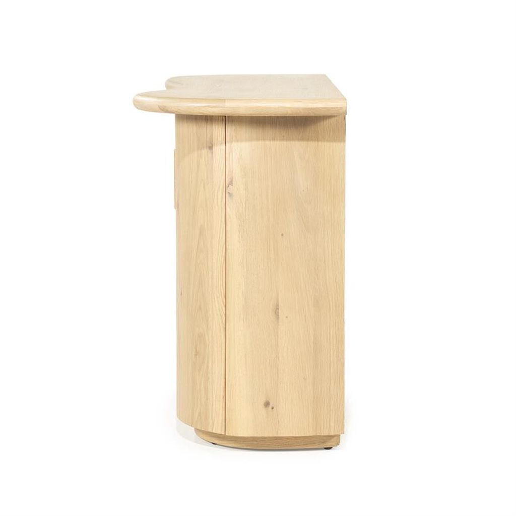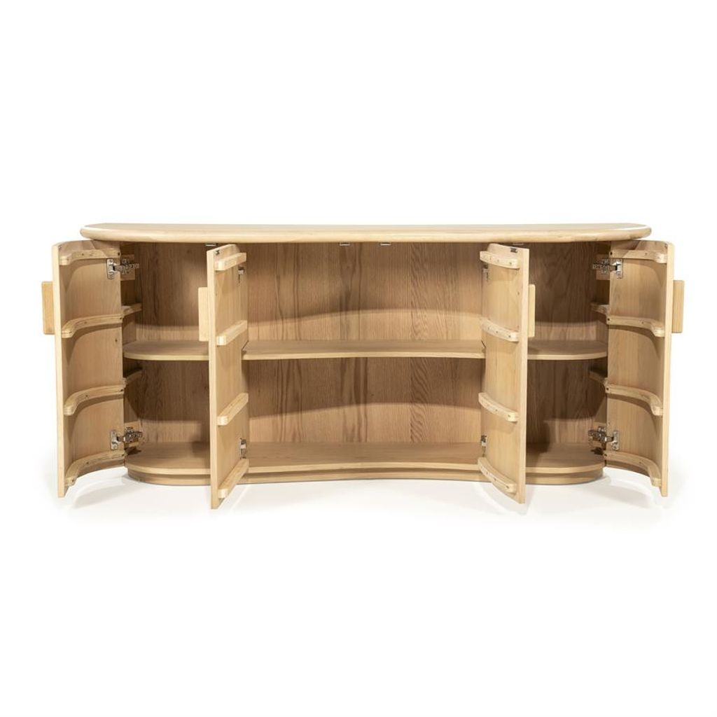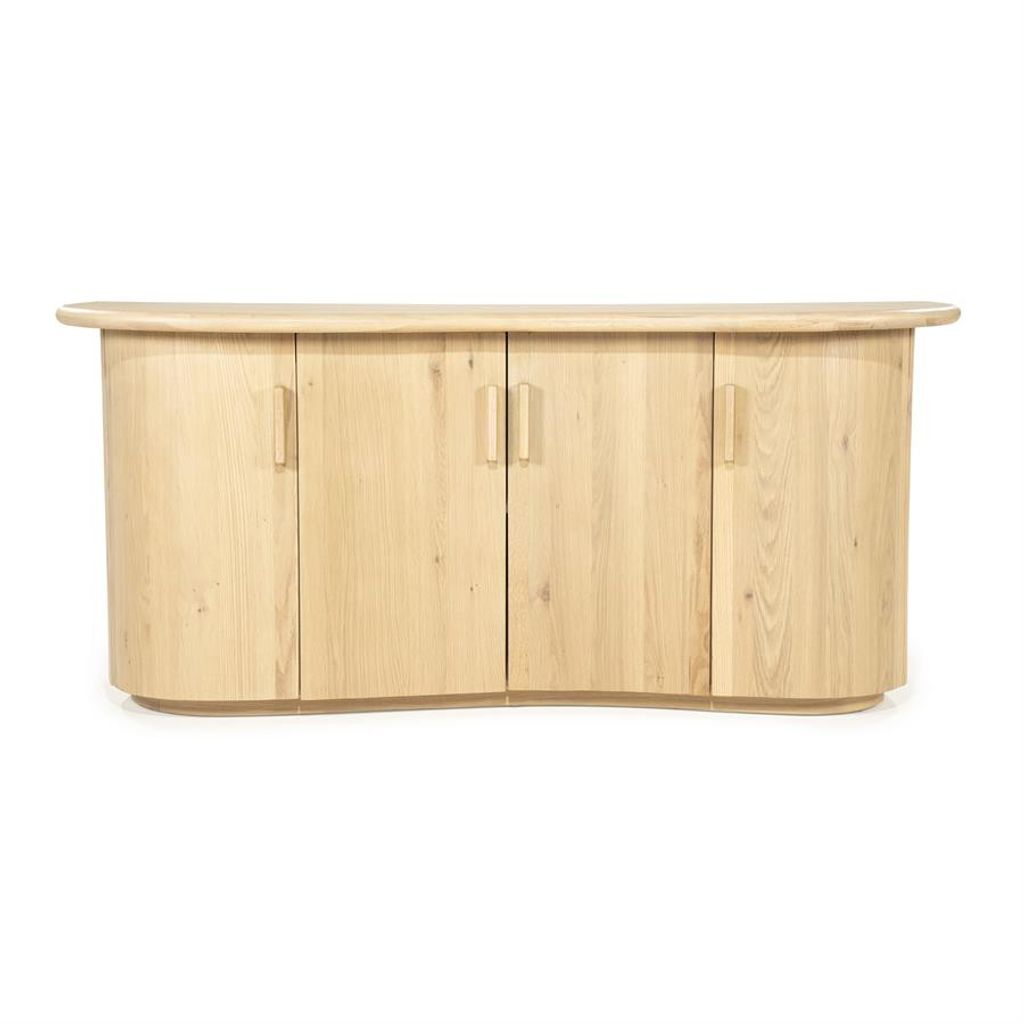 Elegant sideboard i naturlig ek med mjuka rundade former. Perfekt för stilfull förvaring med praktiska hyllor och gedigen design.