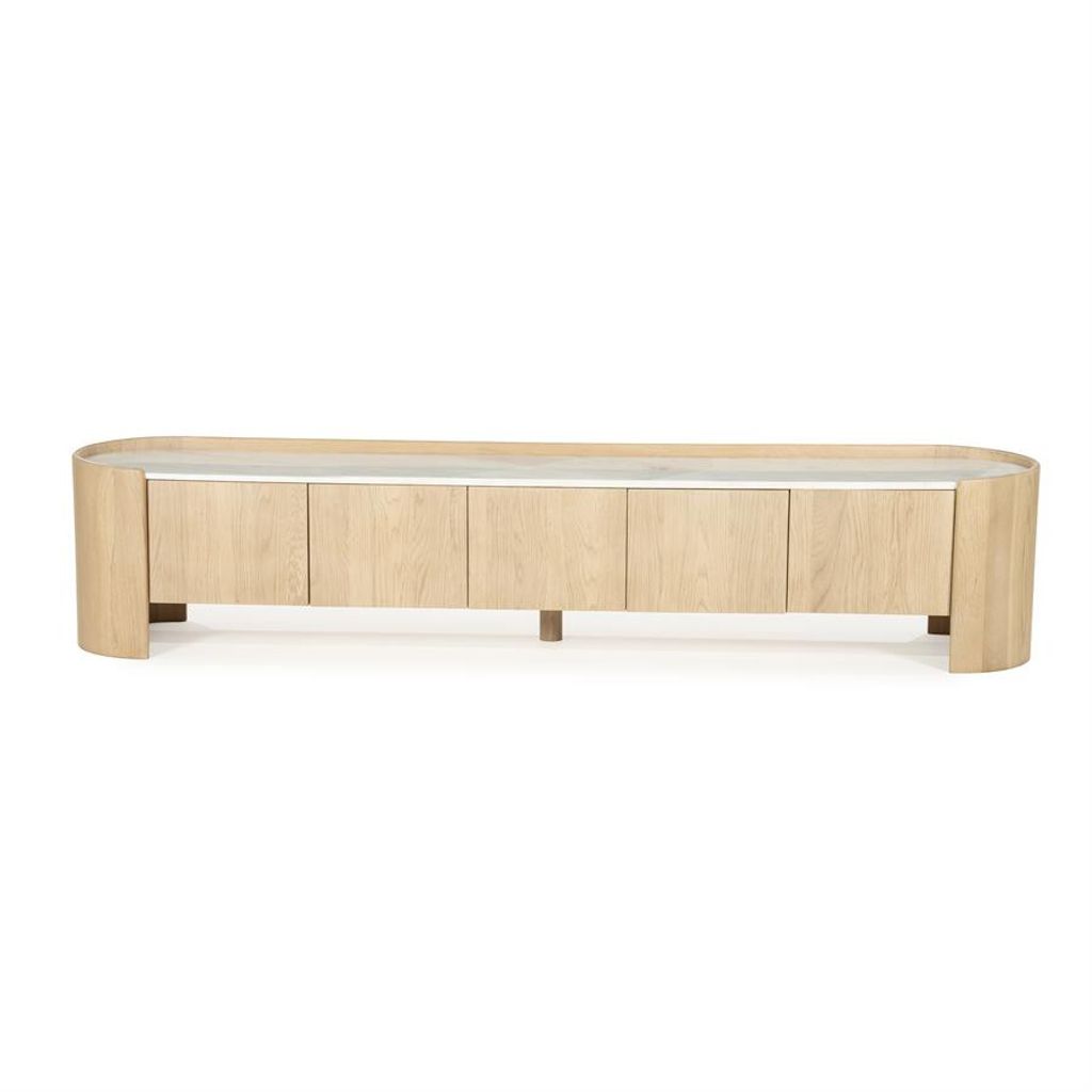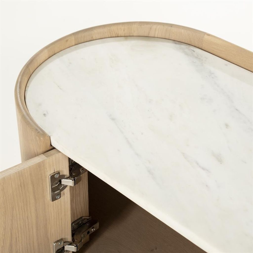 Elegant TV-bänk i ek med marmortopp. Stilren design och generös förvaring för en modern känsla i ditt hem.