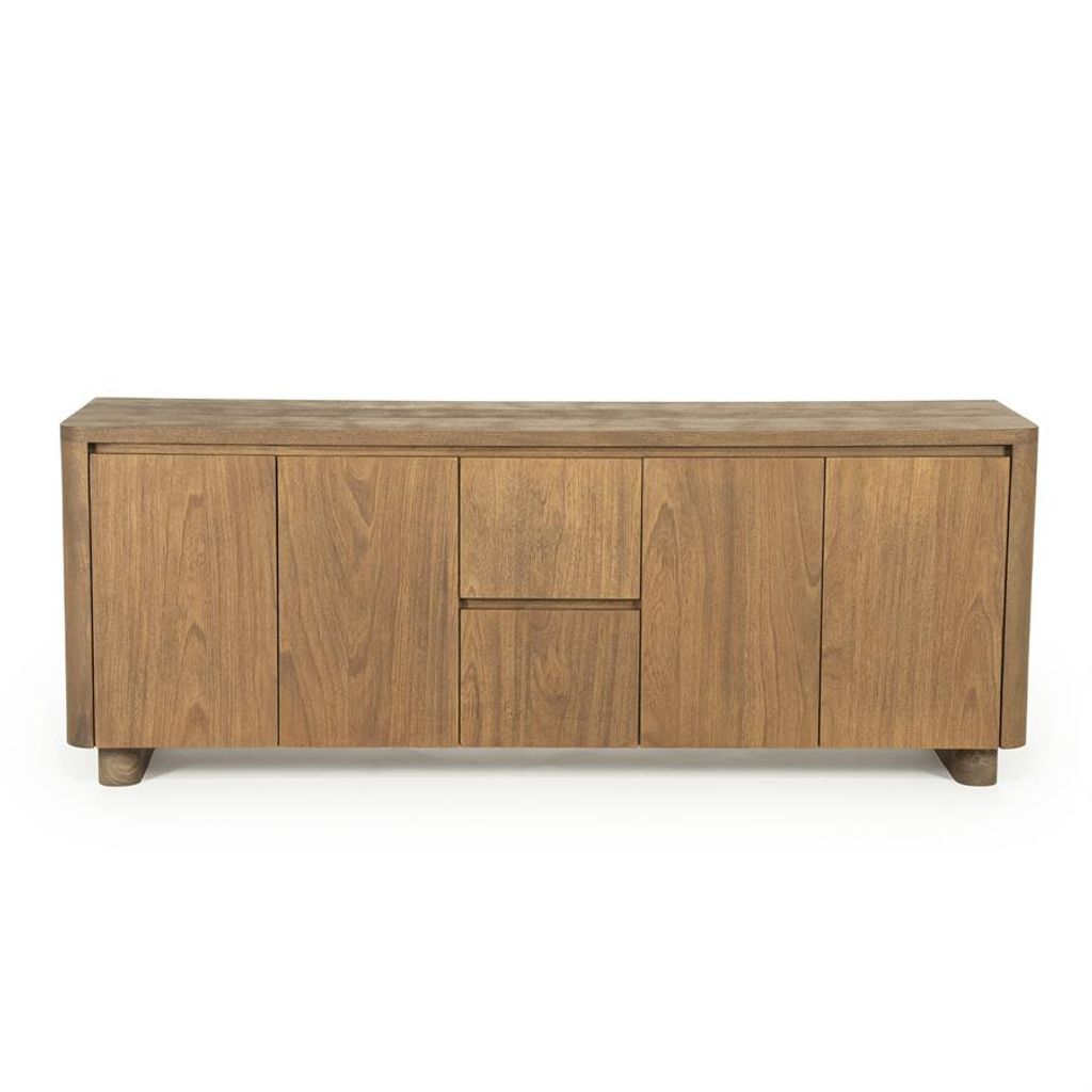 Stilren och rymlig TV-bänk i brunt trä med smart förvaring och modern design.