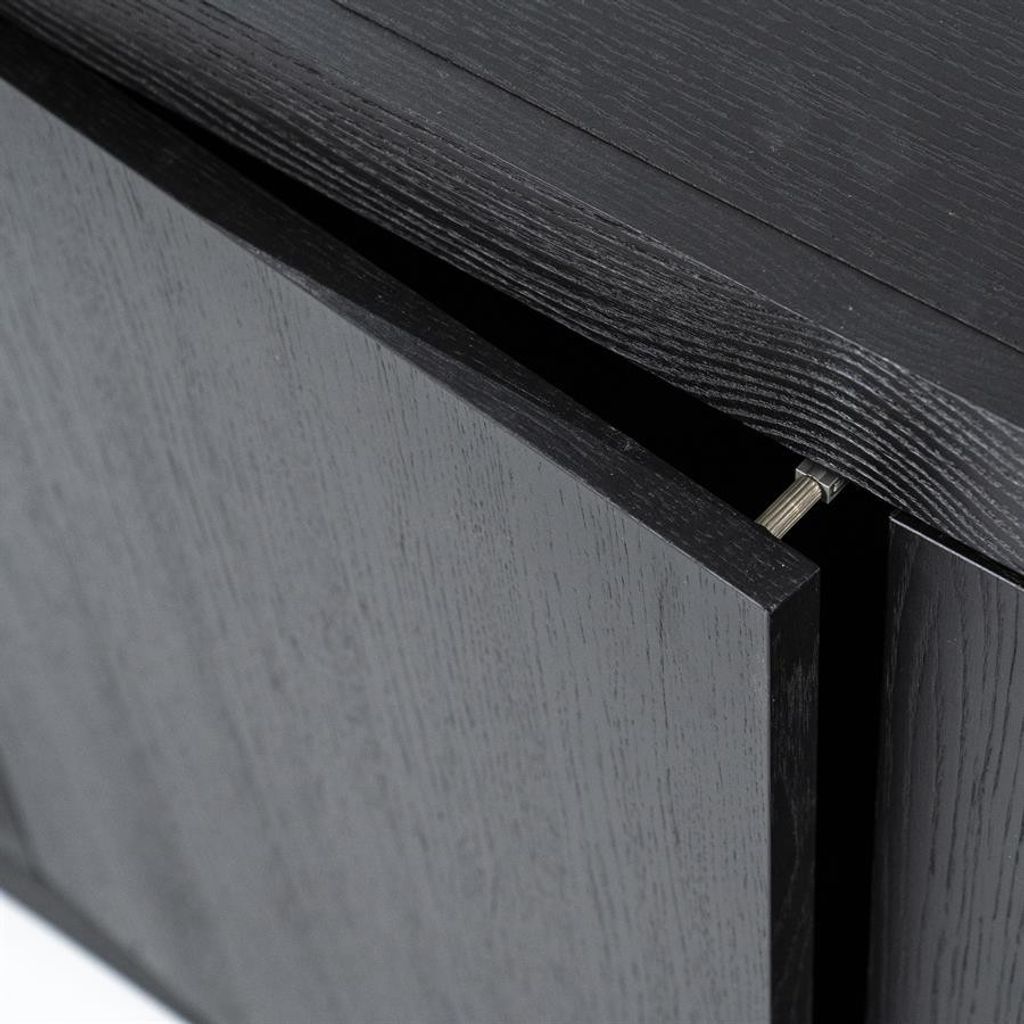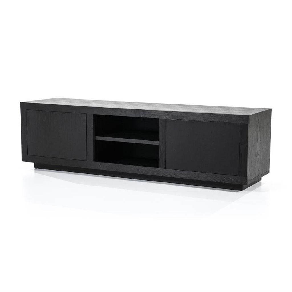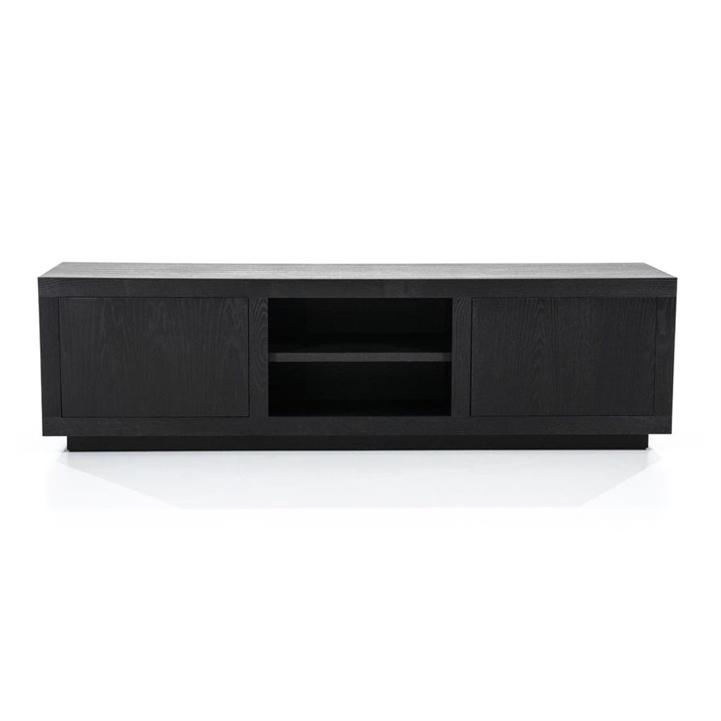Elegant och modern TV-bänk i svart trä med stilren design och praktisk förvaring.