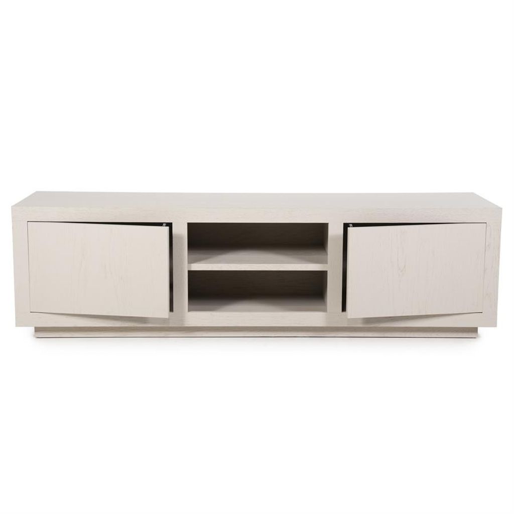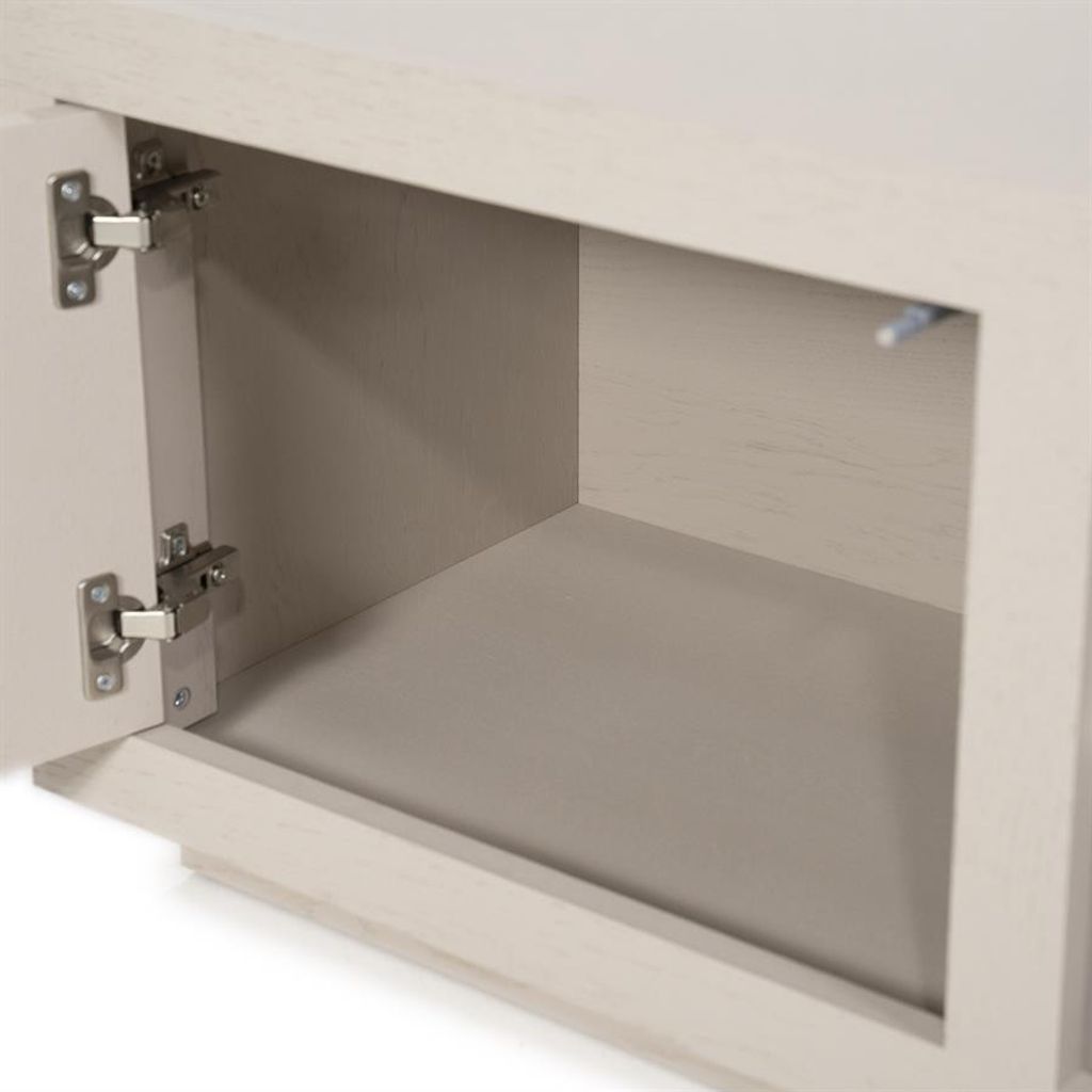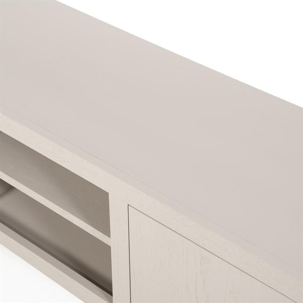 Stilren TV-bänk i taupe mullvad med praktiska förvaringsutrymmen och modern design.