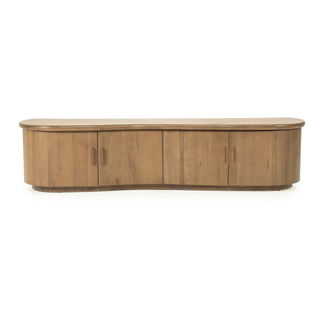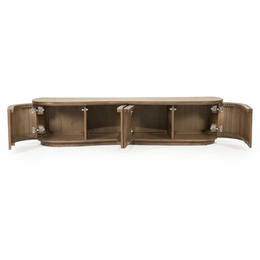 Elegant TV-bänk i brun träfinish med rundad design och rymlig förvaring, perfekt för modern inredning.