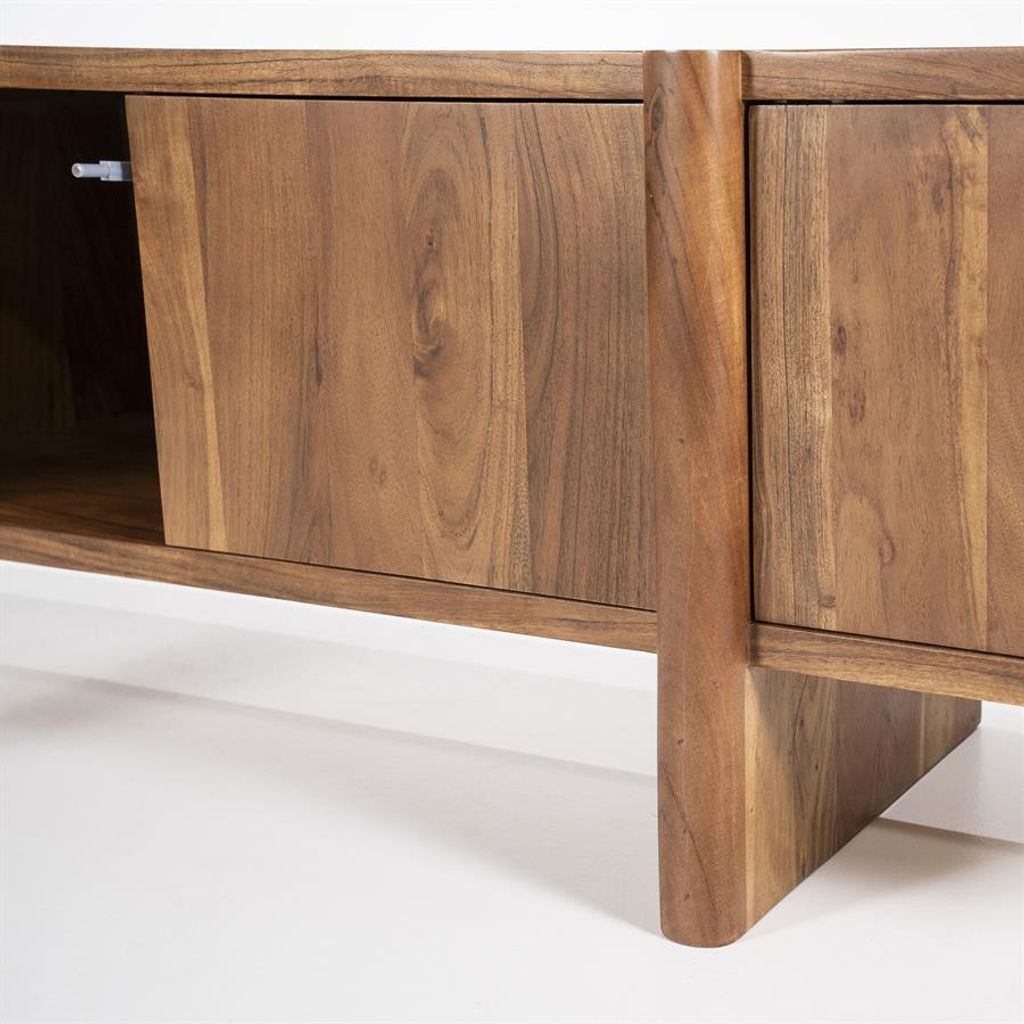 Stilren TV-bänk i brunt akaciaträ med fyra dörrar, perfekt för en elegant och praktisk förvaring.