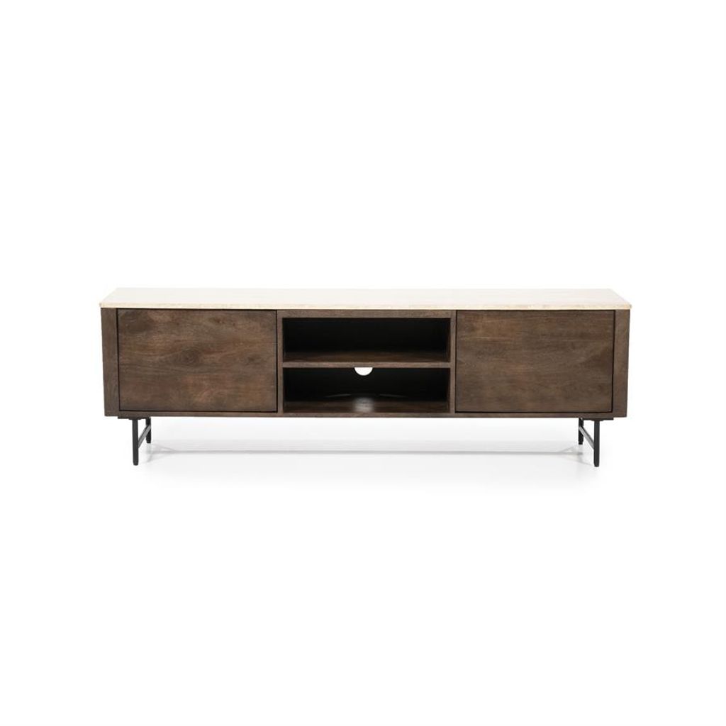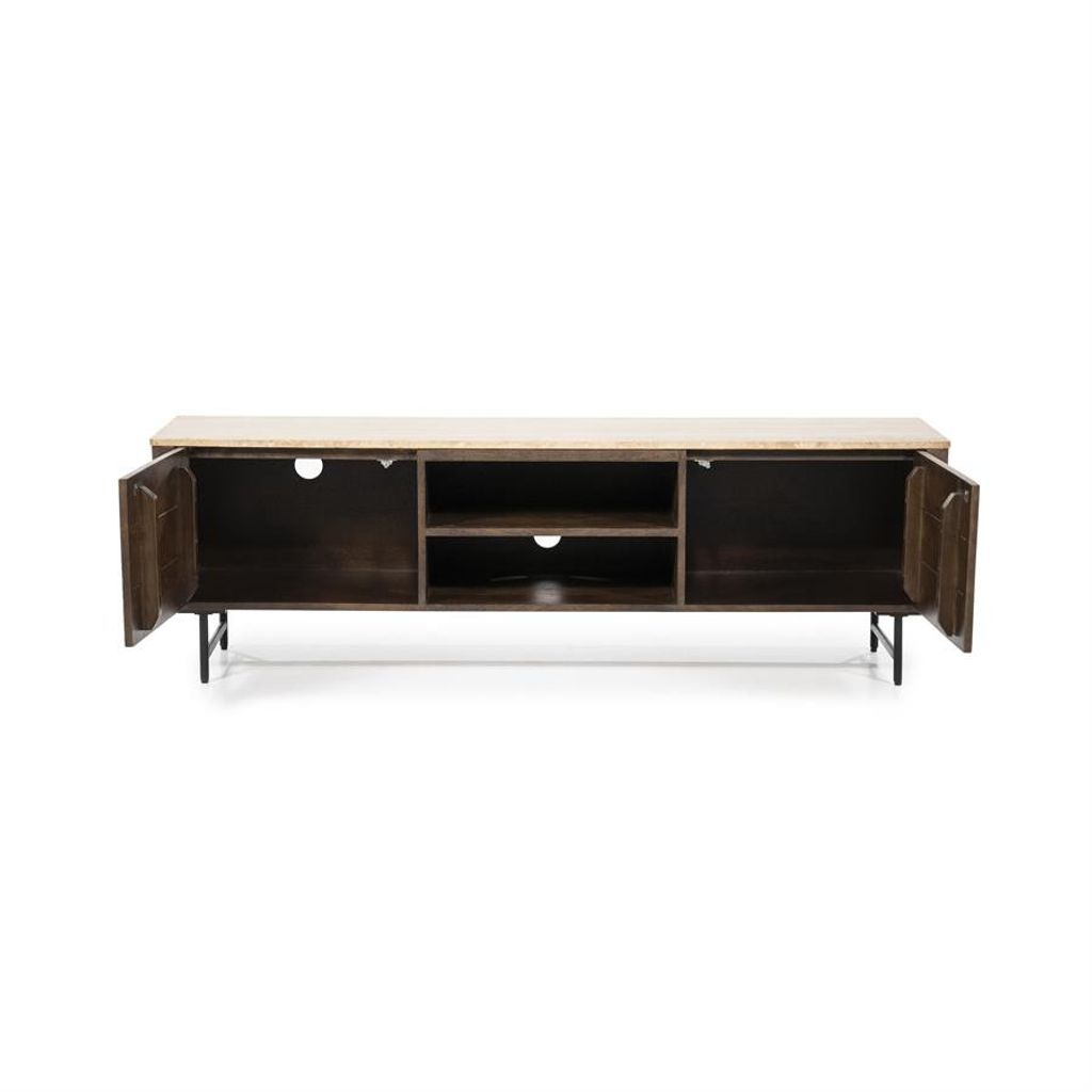 Elegant brun TV-bänk i massiv trä med naturstenstopp, två dörrar och öppna hyllor.