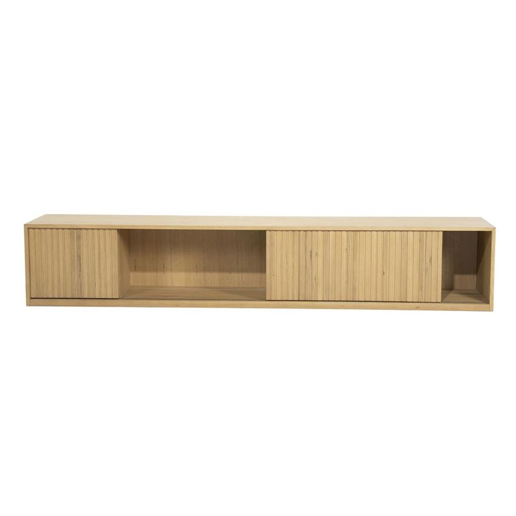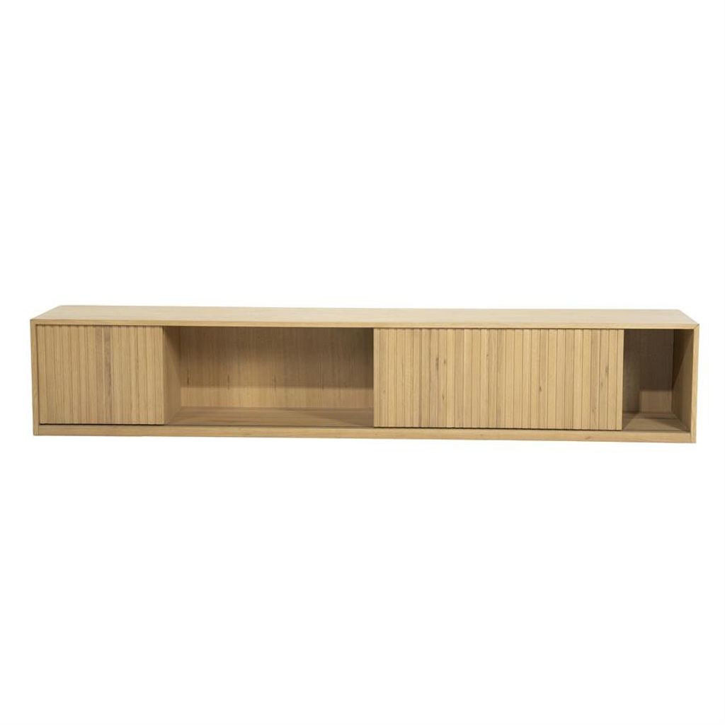Eleganta TV-bänk Milo i naturfärgat trä erbjuder stilren förvaring med både öppna hyllor och skjutdörrar.