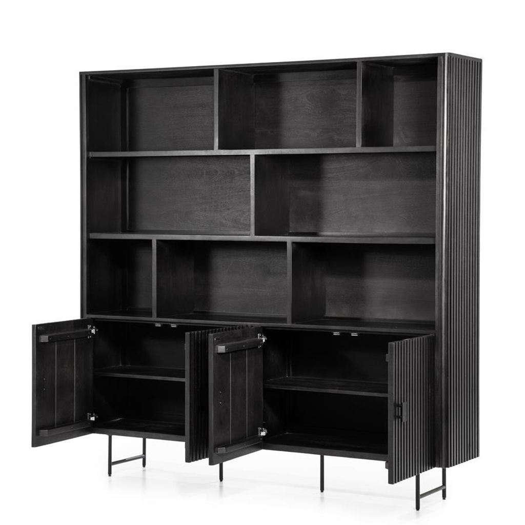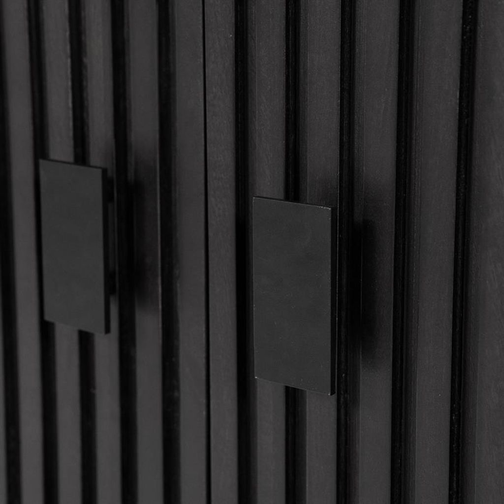 Eleonora Väggskåp Remi i svart är en kombination av elegans och funktionalitet. Med sina rena linjer och moderna design passar det perfekt i det stilmedvetna hemmet. Skåpet erbjuder generös förvaring med flera öppna hyllor för dina dekorativa föremål och dolda skåp för det du vill ha undanplockat. Tillverkat i högkvalitativt material med en matt svart finish ger det en sofistikerad touch till ditt rum. De subtila handtagen och den räfflade ytan bidrar till en unik visuell textur som gör detta väggskåp till ett blickfång.