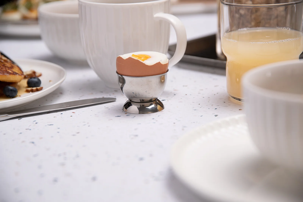 Slitstark äggkopp i rostfritt stål, framtagen för att tåla daglig använding och rengöring i diskmaskin. Äggkoppen har en enkel design och passar utmärkt i många olika miljöer inom den professionella verksamheten, vare sig det är på hotellfrukosten eller på ett café.