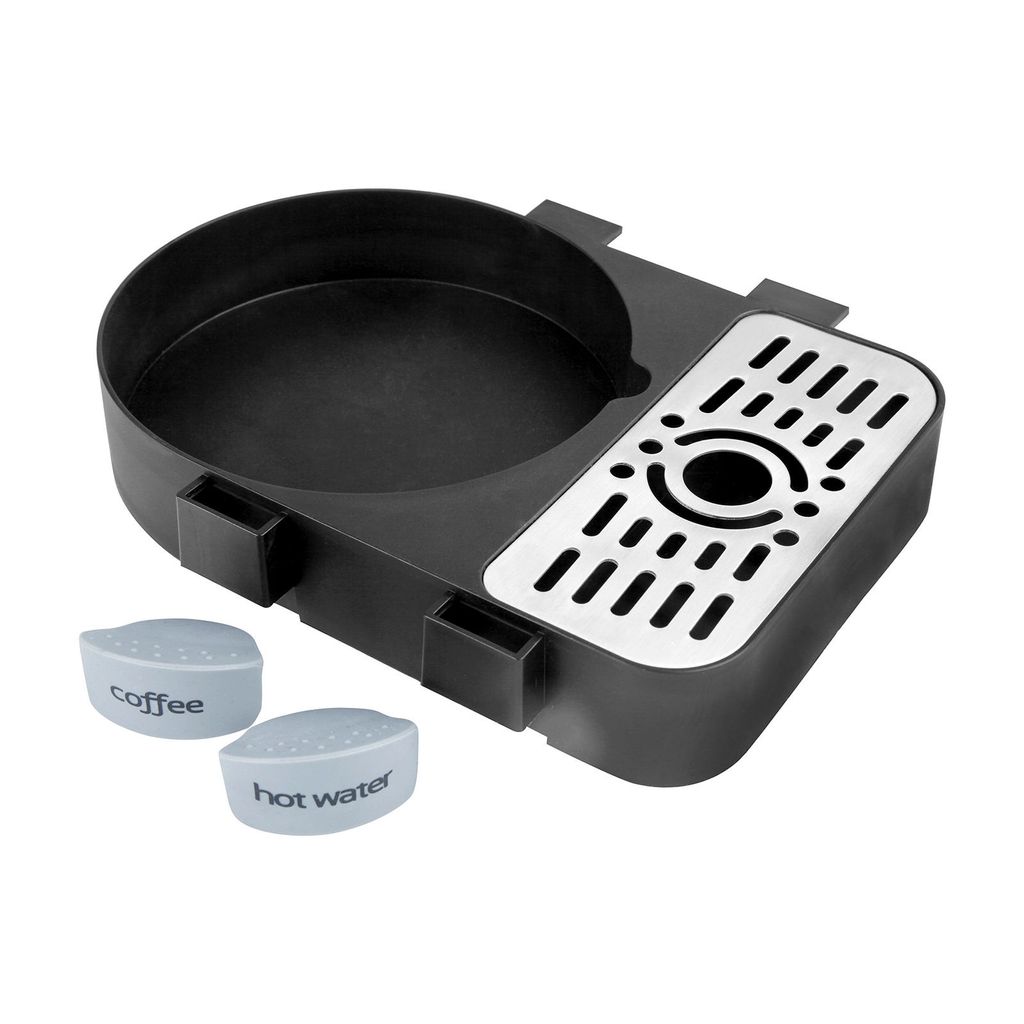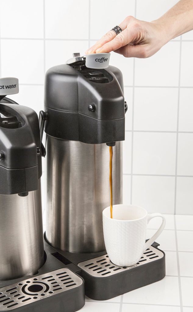 Tåligt och rejält droppställ med silikonmarkörer till pumptermosar. Det ingår en markör för kaffe och en för varmt vatten. Framtaget för den professionella verksamheten och passar perfekt på exempelvis kaféet eller vid lunchbuffén.