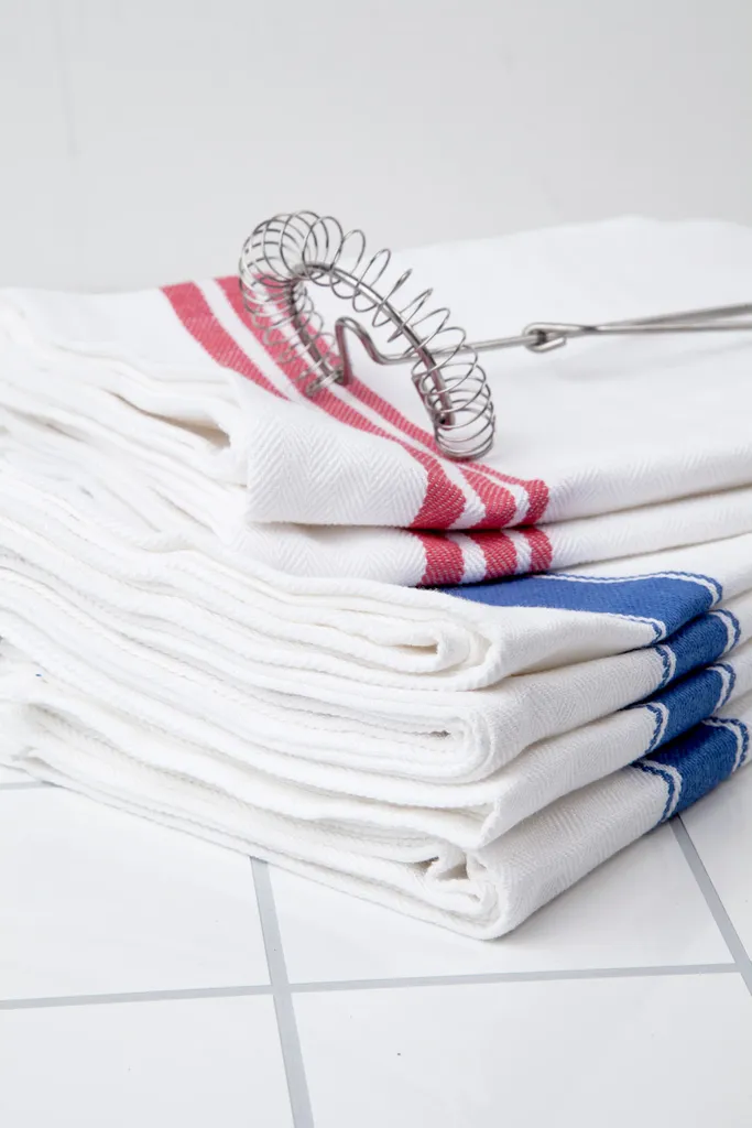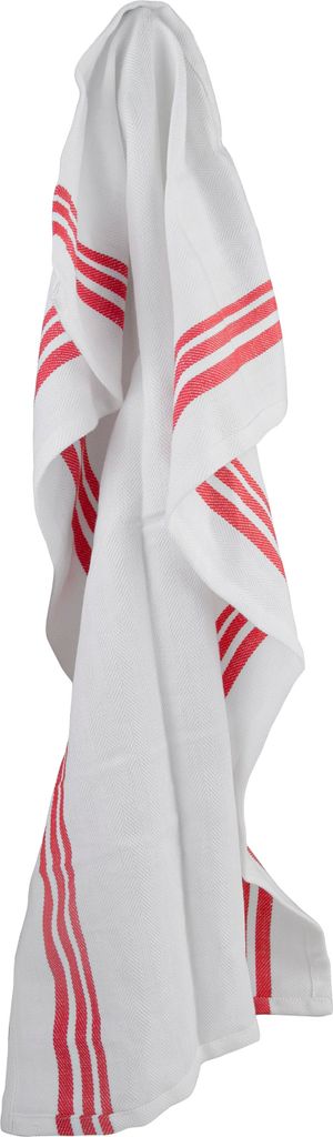 Vit kökshanduk med röda ränder som passat utmärkt för såväl det professionella köket som i hemmaköket. Handuken är tillverkad i tvättålig och slitstark bommulväv och är helt fri från gifter och kemikalier certifierad av STANDARD 100 by OEKO-TEX ®.