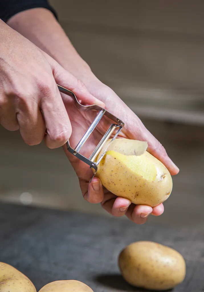Skarp och följsam rotfruktskalare som underlättar skalningen och effektiviserar tiden i det professionella köket. Skalaren är tillverkad i rostfritt 18/10 stål och är otroligt slittålig, den tål daglig använding och rengöring.