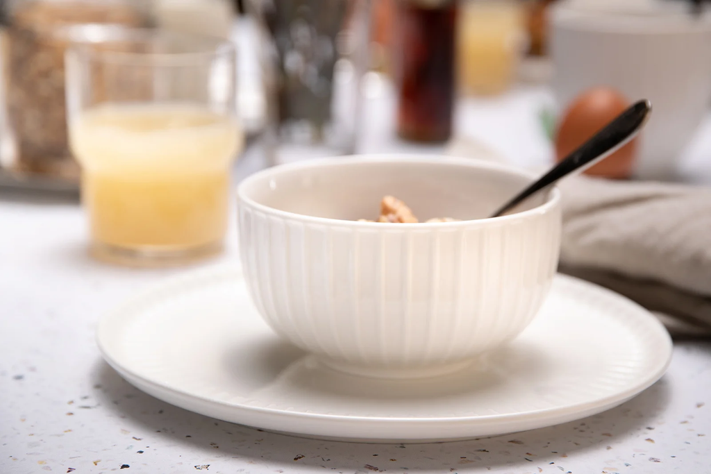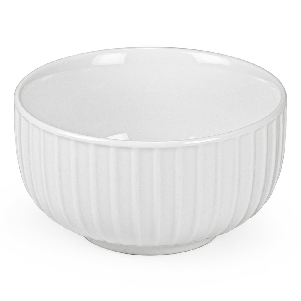 Skål i serien Phoenix. Skålen är tillverkad av aluminium förstärkt porslin som bränns vid högre temperatur för bättre stöttålighet och längre hållbarhet. Skålen är dekorerad med ränder i relief.