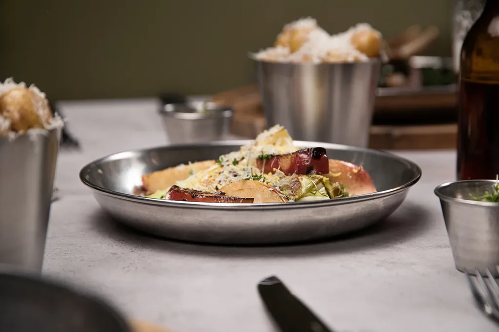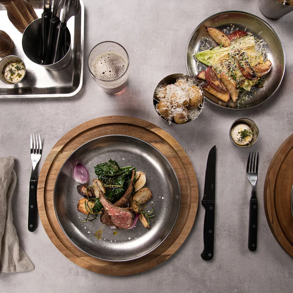 Tålig rostfri tallrik med härlig vintage design. Tallriken passar utmärkt att användas på restauranger och cafeér. En otroligt slitstark och hållbar tallrik som tål daglig använding och rengöring inom den professionella branschen.