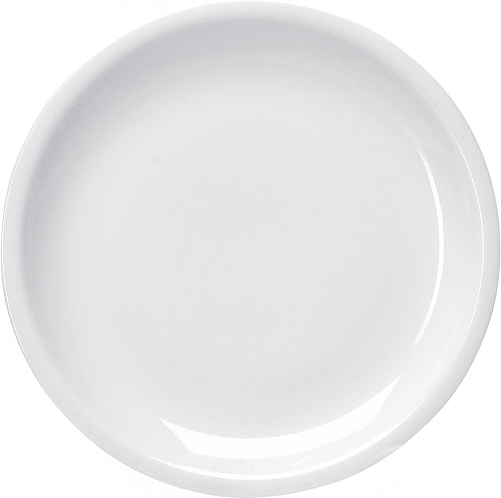 Klassisk vit tallrik i serien Pegasus. Tallriken har en lätt upphöjd kant utan bräm och en flat yta. Passat umärkt som komplement till pizzatallrikarna i samma serie. Staplas enkelt för platsbesparing. Tillverkad av slittåligt fältspatporslin.
