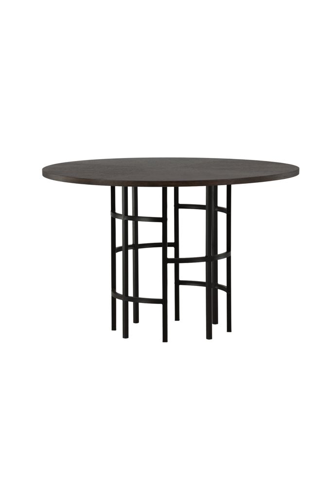 Modernt runt matbord med brunfärgad bordsskiva och svart metallunderrede, perfekt för sociala sammankomster.