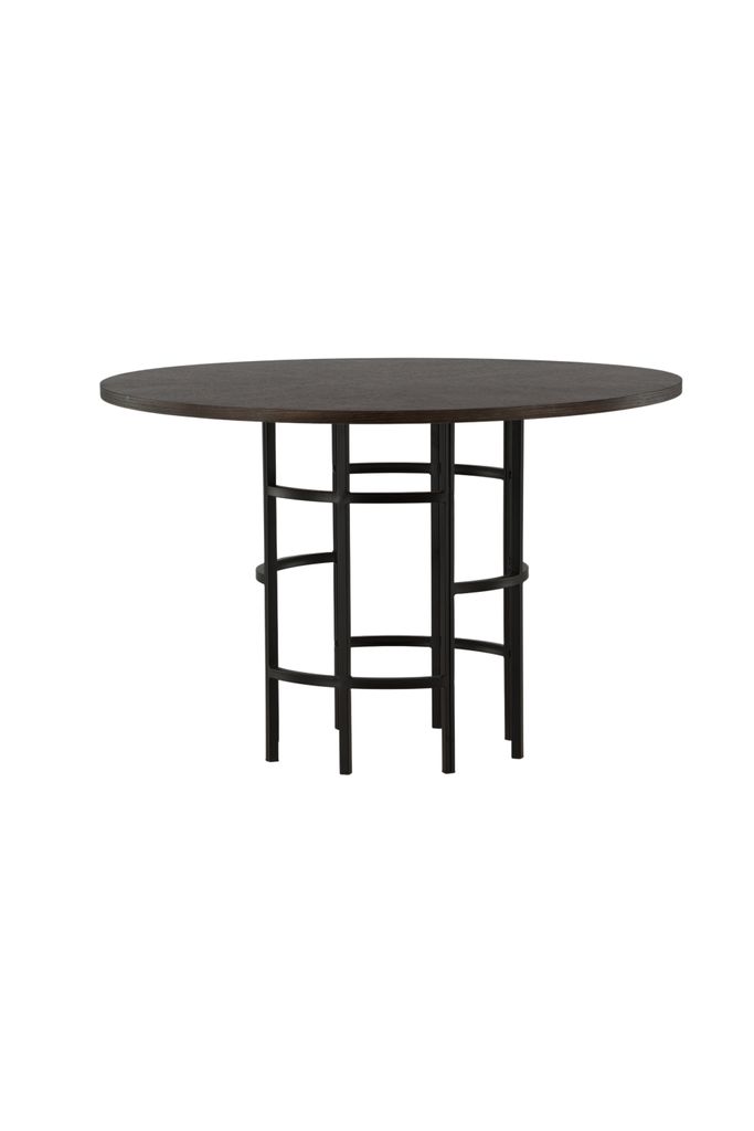 Bordets svarta cylinderformade metallunderrede förstärker den moderna designen och tillför en touch av industriell elegans. Med en diameter på 115 cm och en höjd på 75 cm, erbjuder detta bord en perfekt plats för sociala sammankomster och middagar där ingen behöver känna sig utanför.