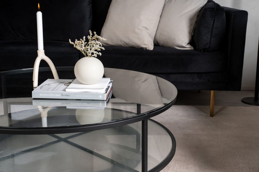 Elegant runt soffbord i svart stål och glas, perfekt för modern inredning. Generös storlek med 100 cm diameter.