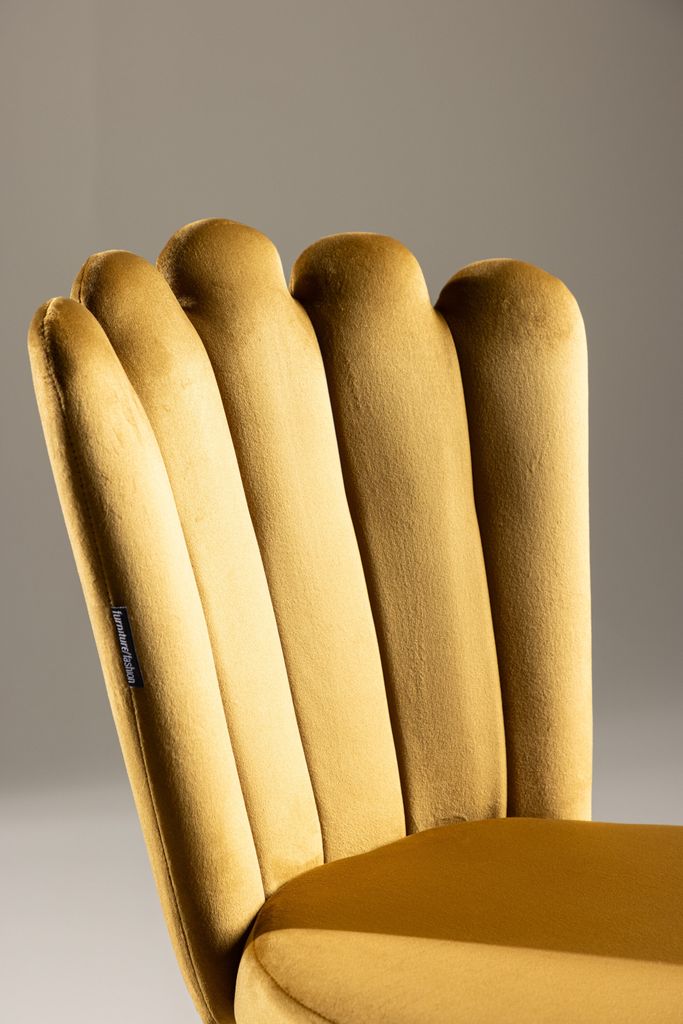 Limhamn matstol erbjuder modern elegans med sin dekorativa snäckformade rygg och gula sammetstyg. Perfekt för stilrena hem.