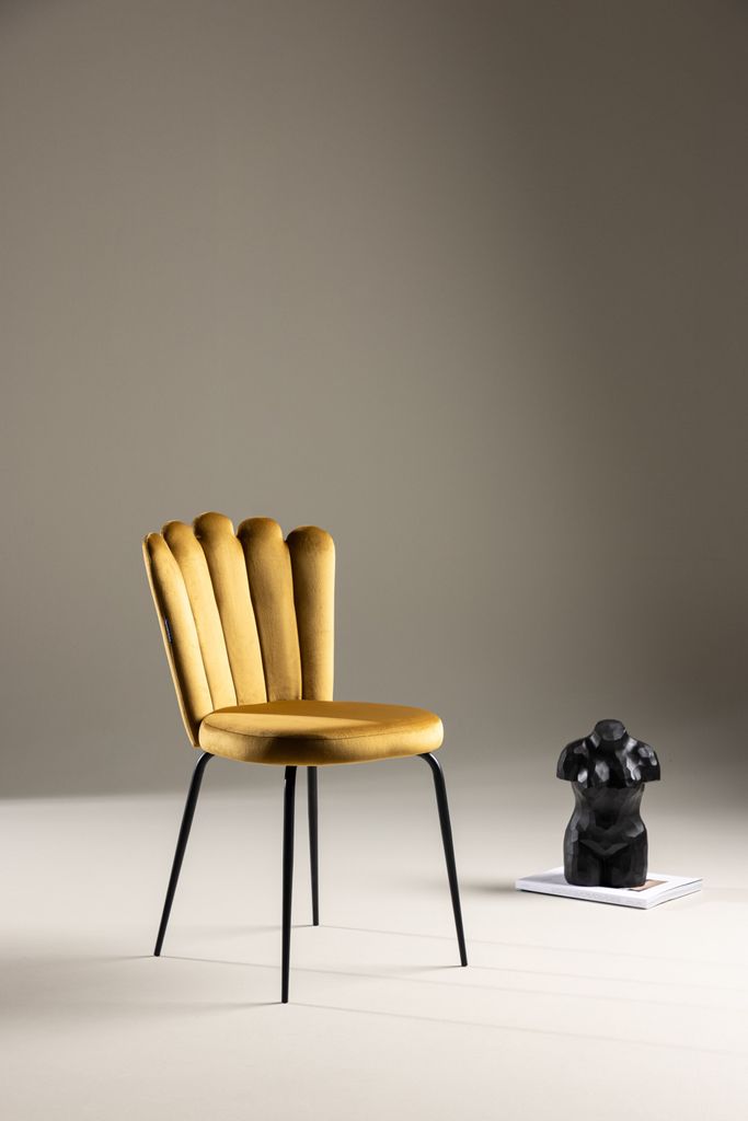 De svarta pulverlackerade metallbenen ger en stabil bas och kompletterar den livfulla gula färgen. Dess rundade sits av sammet ger både komfort och elegans, vilket gör den perfekt för både vardagsrum och matsal. Den lätta montering innebär att du snabbt kan njuta av ditt nya blickfång i hemmet.