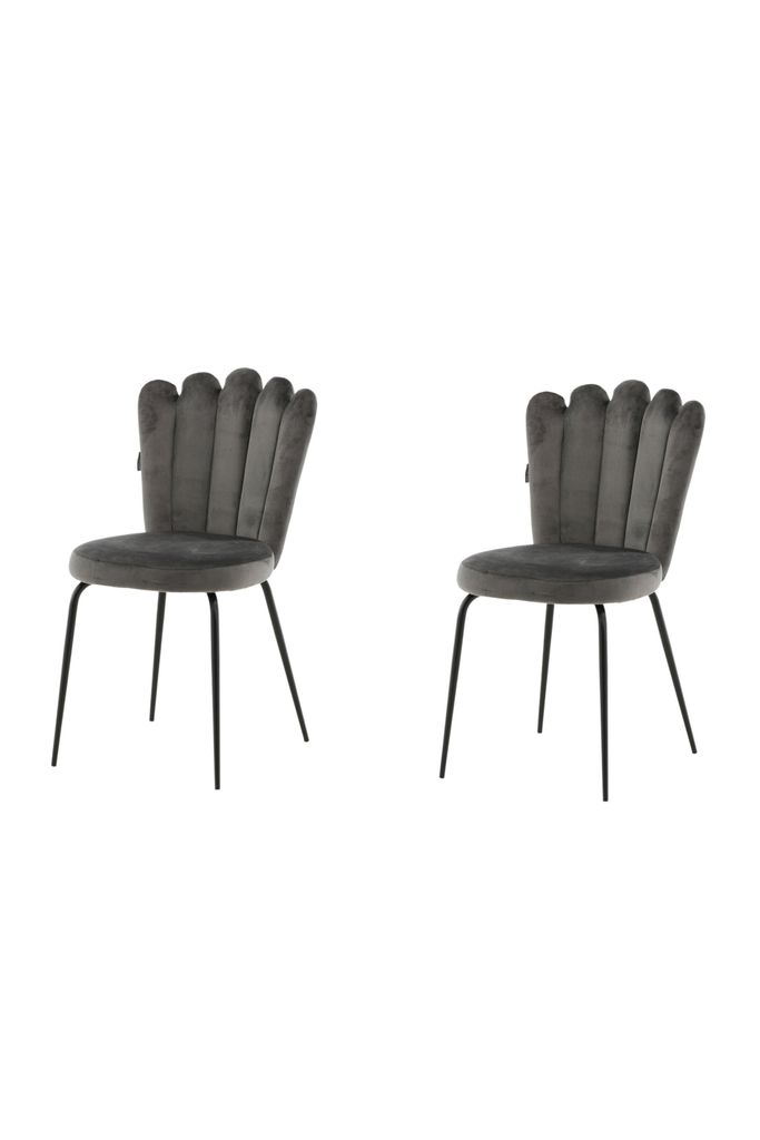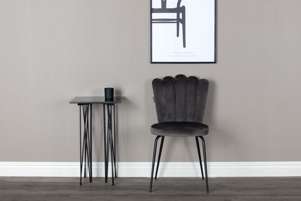 Limhamn matstol med snäckformad rygg i grå sammet. Svarta metallben. Modern och bekväm design.