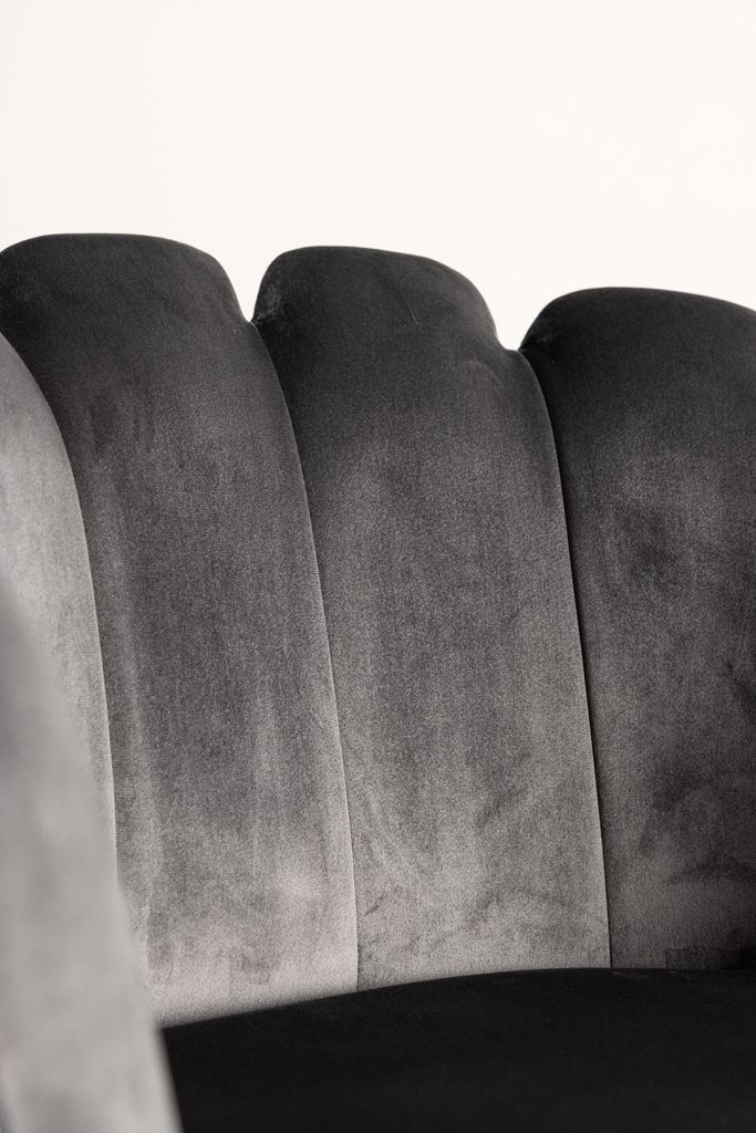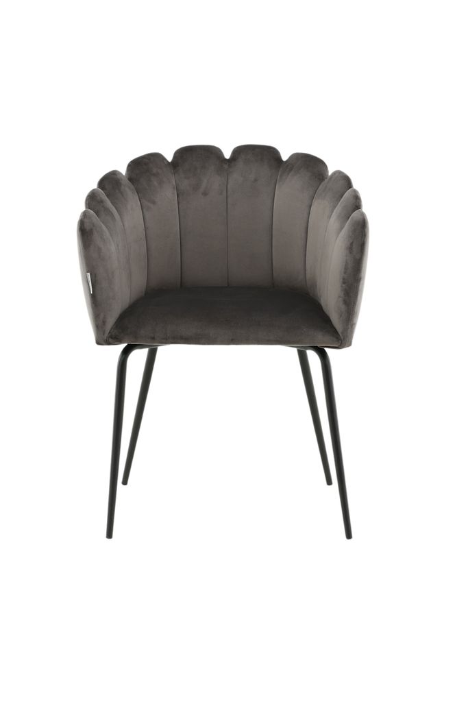 Elegant karmstol i grått sammetstyg med svart metallben. Perfekt för att skapa en stilfull och bekväm matplats.