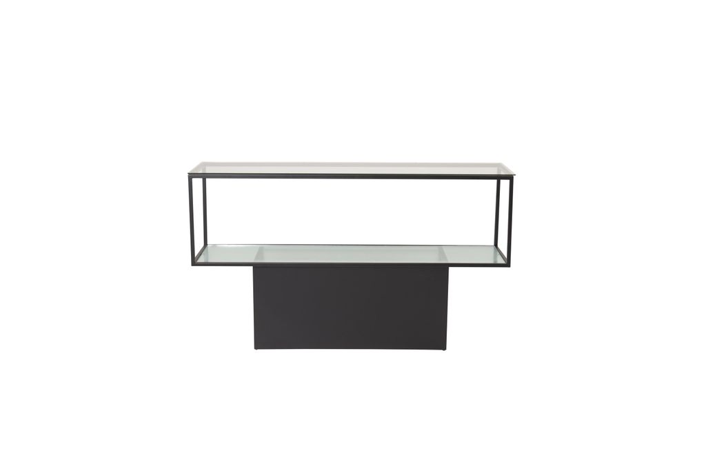 Elegant sidobord i glas och svart stål med stilren design och praktisk hylla för förvaring.
