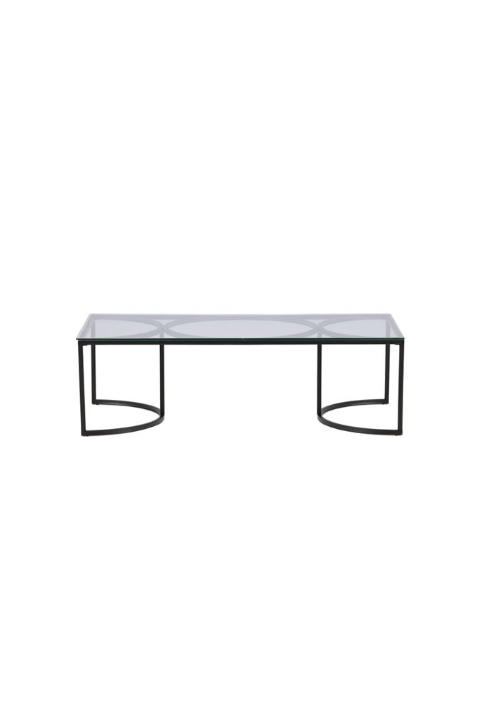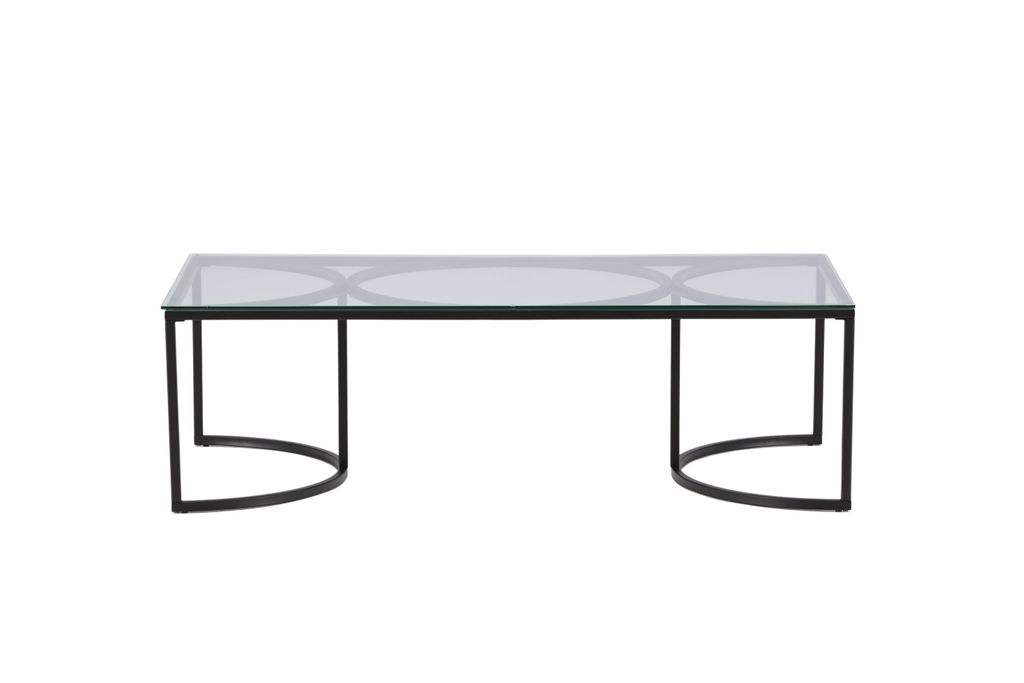 Inred ditt vardagsrum med det eleganta och moderna Skanör Soffbordet. Bordet har en unik industriell design med en rektangulär toppskiva i transparent glas som avslöjar de stilrena, cirkelformade stommarna i svart stål.