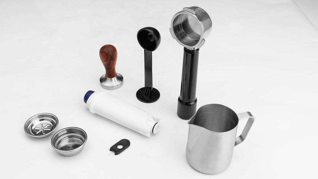 Tillbehör: dubbelväggsfilter för 1 och 2 koppar, filter för ESE-pods, mjölkkanna, måttsked med tamper, rengöringsverktyg, vattenfilter
