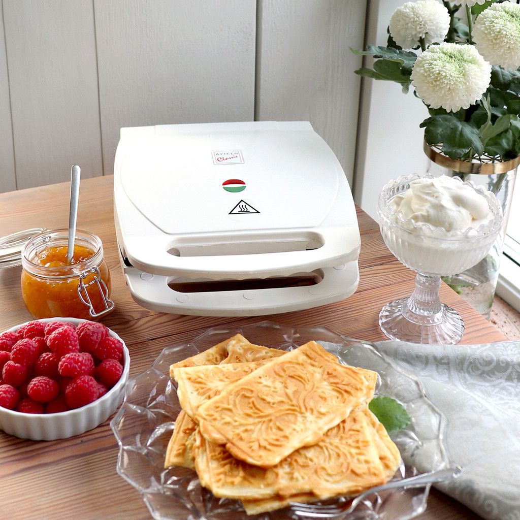 Gorojärnet från Åviken kombinerar traditionellt mönster och modern teknik. Det värms upp snabbt med jämn värmefördelning tack vare effektiva värmeelement. Den non-stick-belagda ytan gör att du enkelt lossar dina kakor utan att de går sönder – samtidigt som rengöringen blir enkel och smidig. Kompakt och elegant, med en sval utsida och indikatorlampa, vilket gör användningen både trygg och bekväm.