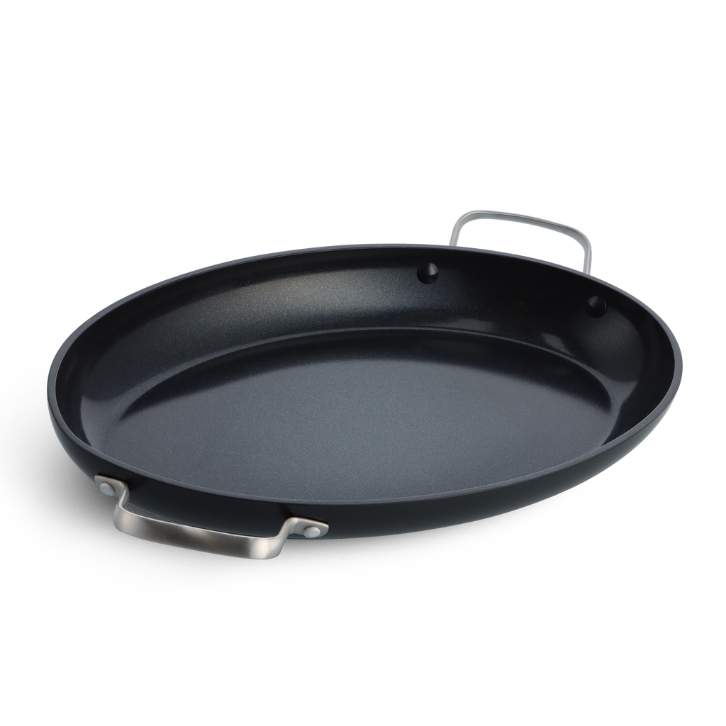 GreenPan Craft oval fiskpanna, 40 × 25 cm, är det perfekta verktyget för att tillaga hela fiskar, filéer eller stora grönsaksportioner med finess. Utrustad med en diamantförstärkt keramisk non-stick-beläggning och tillverkad i härdat aluminium – designad för att hålla vid intensiv användning, utan behov av PFAS. En lyxig kombination av hållbarhet och högkvalitativ köksestetik.